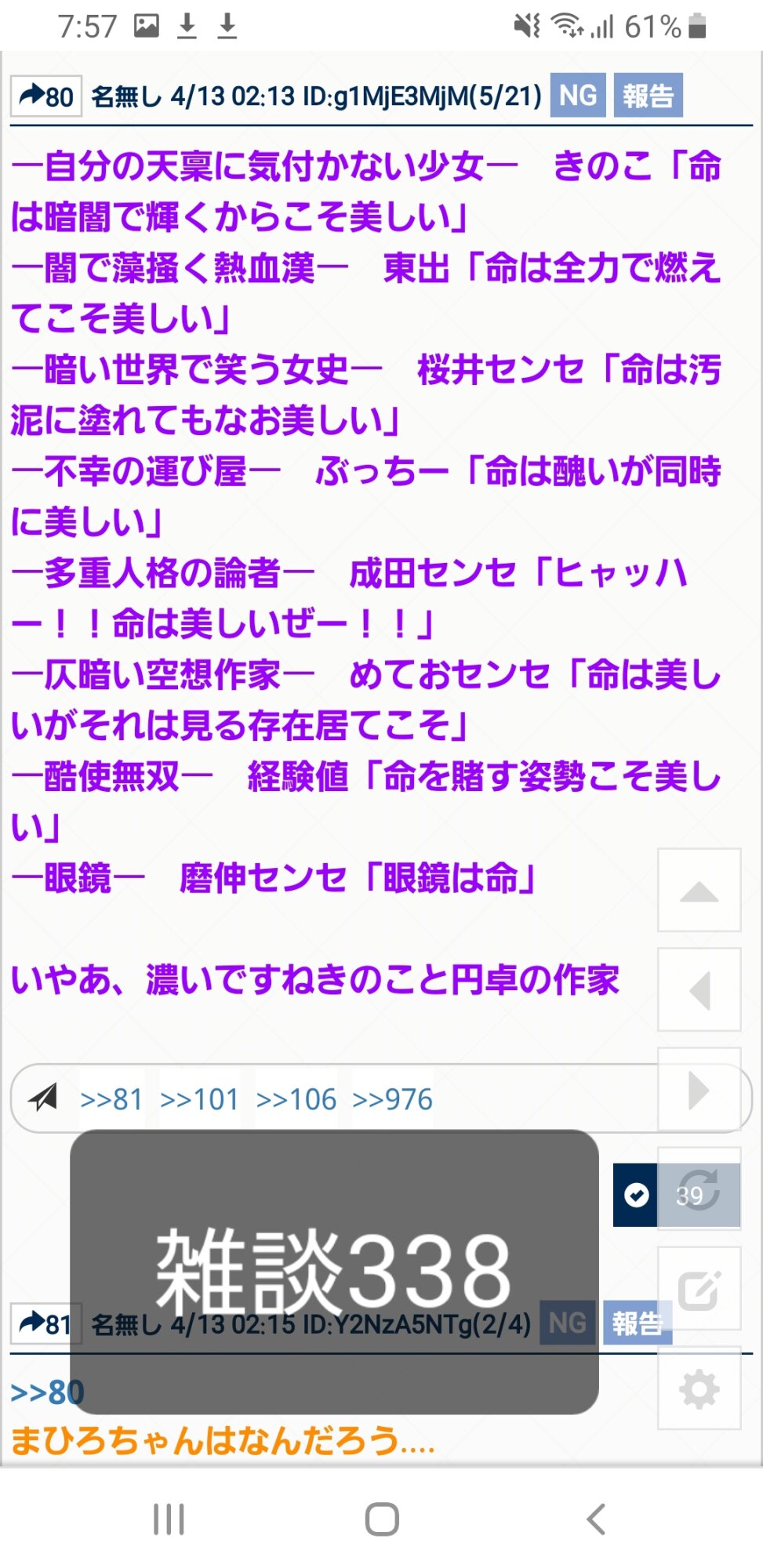 「(後輩への)不敬に喝を。強ボスに死を。育成を軽んじる者、低レアを愚弄する者、お前たちの無知は、ここで濯がれる。(FGO沼に)沈め沈め沈め沈め! 『疑問を漱げ、キモく優しき雑談スレ』!」