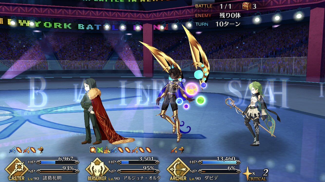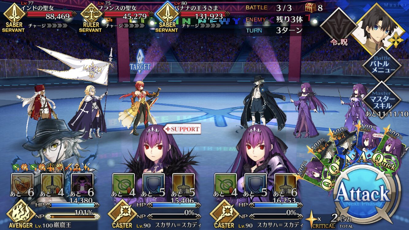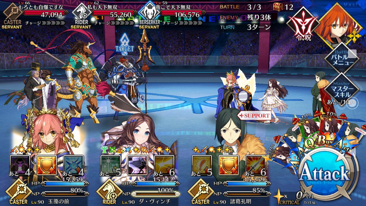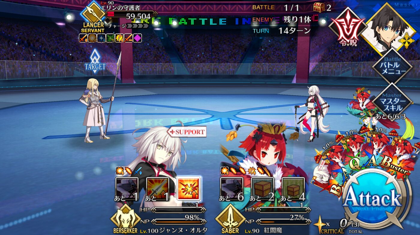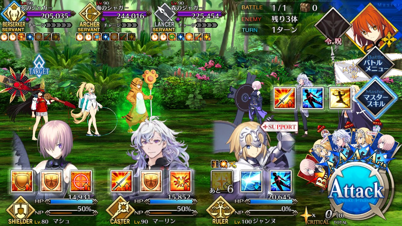 確実に3ターン、黒ごま取られても魔術礼装やスキルの回避をうまく使えば5ターン単騎で耐えられる今年もジャガーの国はめんどくささの塊みたいなクエストだったな…あの手この手を試してみて令呪も残り一画になってしまって、イライラしながら試しにフレの神ジュナ借りたら舐めプしながら勝てたのがやけに腹立つ