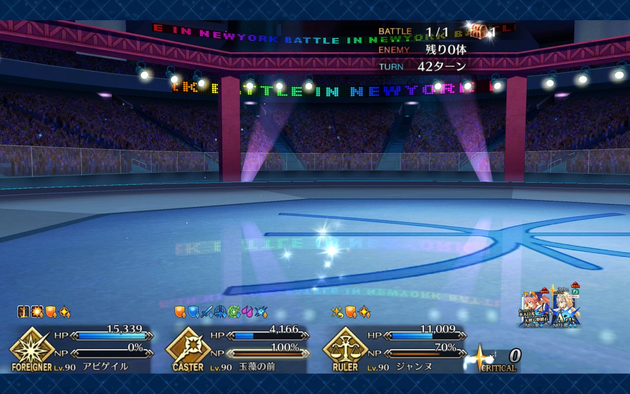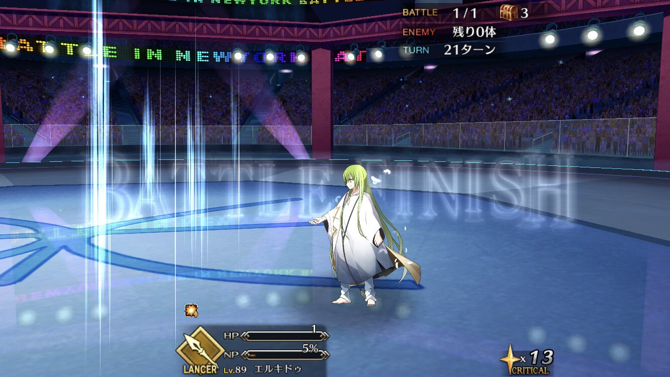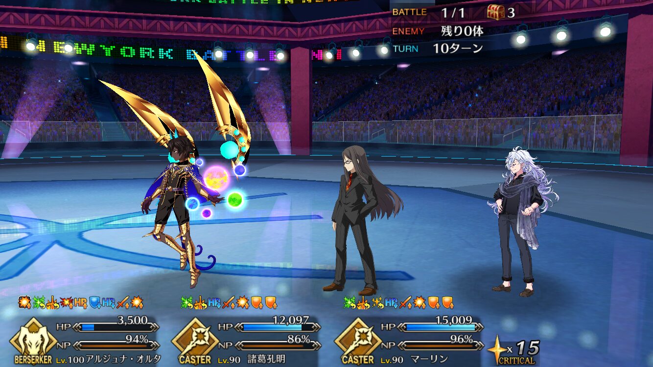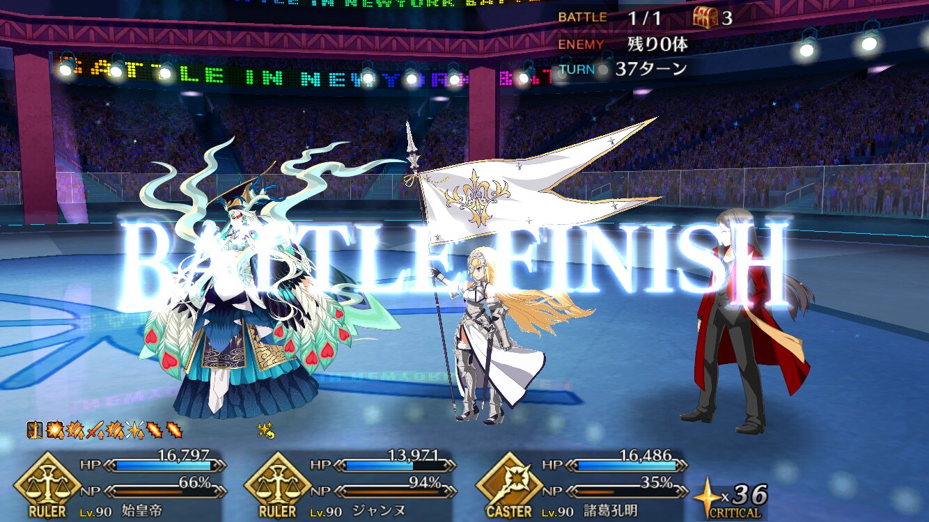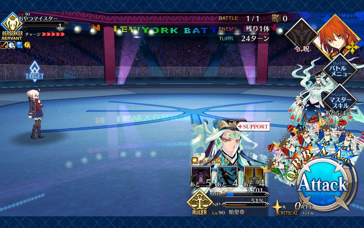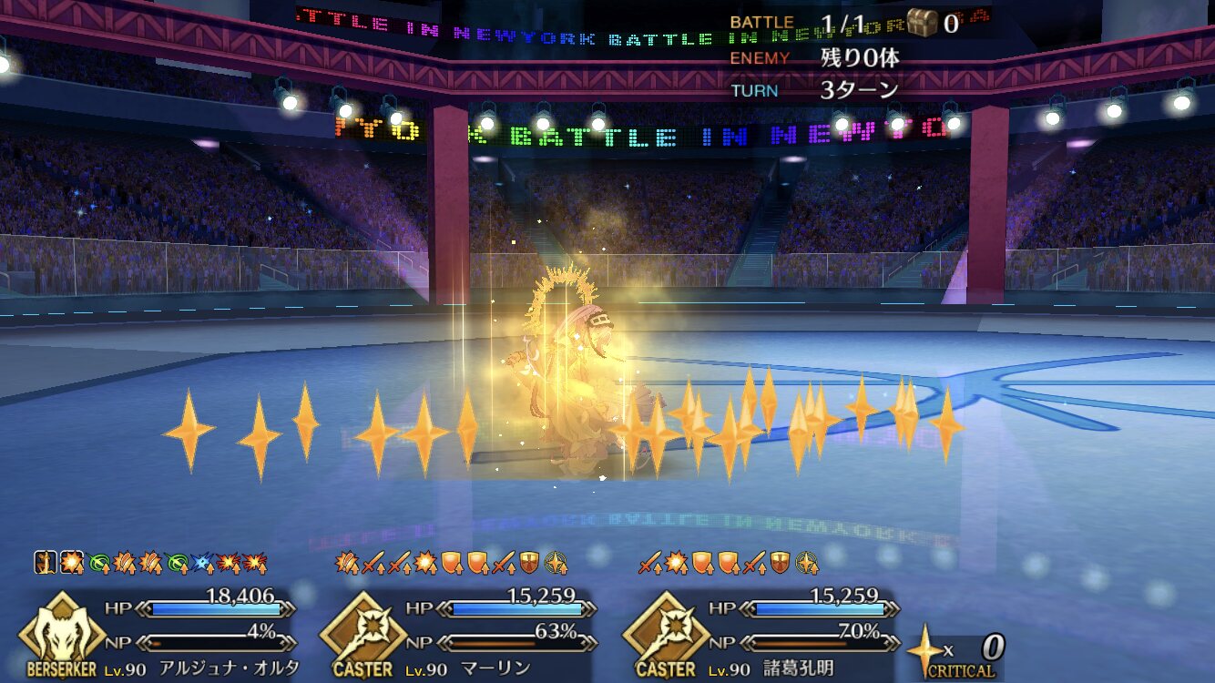 確実に3ターン、黒ごま取られても魔術礼装やスキルの回避をうまく使えば5ターン単騎で耐えられる今年もジャガーの国はめんどくささの塊みたいなクエストだったな…あの手この手を試してみて令呪も残り一画になってしまって、イライラしながら試しにフレの神ジュナ借りたら舐めプしながら勝てたのがやけに腹立つ