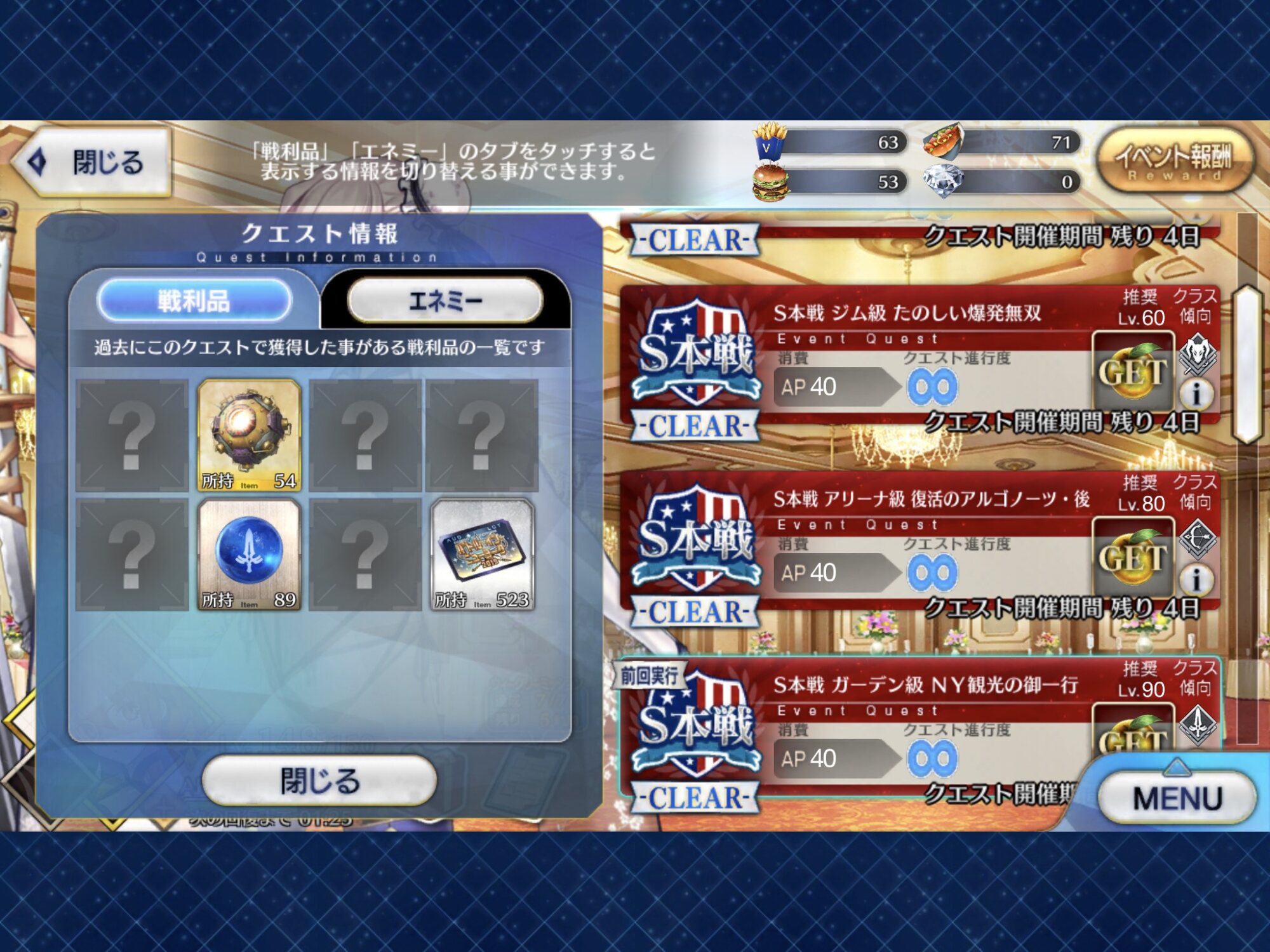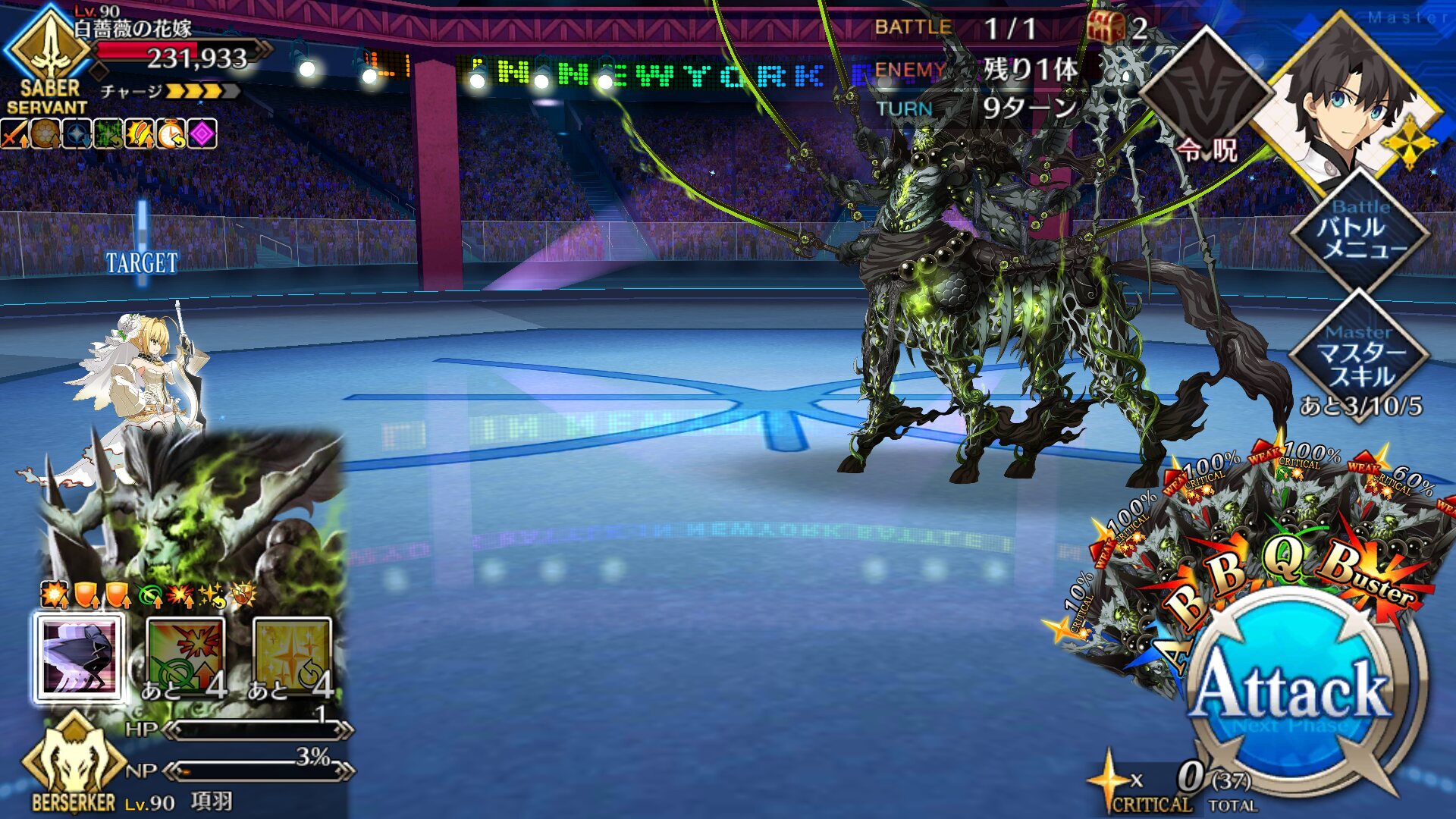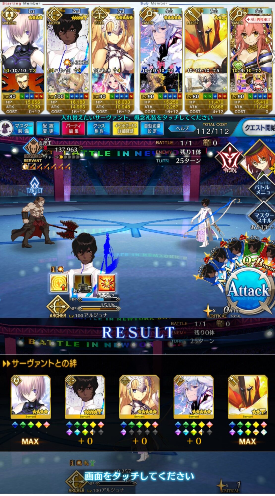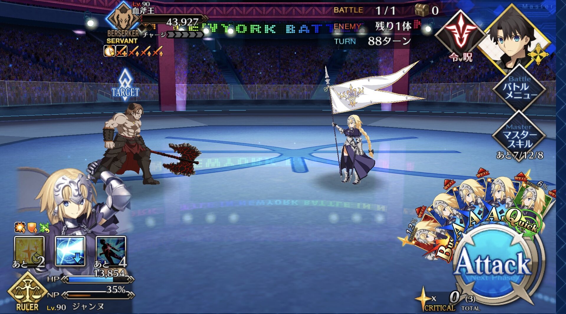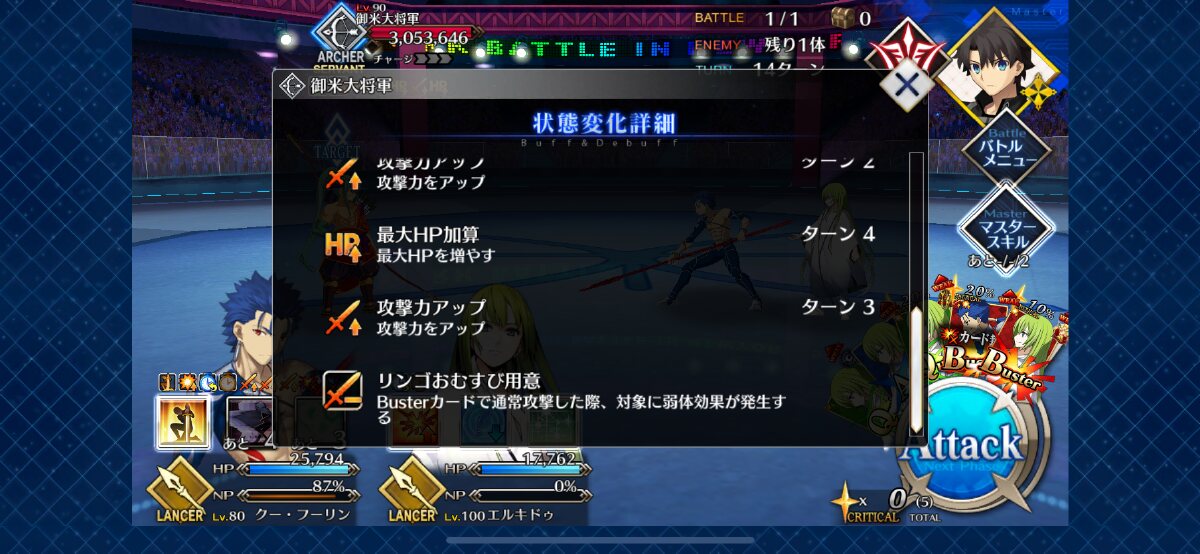 確実に3ターン、黒ごま取られても魔術礼装やスキルの回避をうまく使えば5ターン単騎で耐えられる今年もジャガーの国はめんどくささの塊みたいなクエストだったな…あの手この手を試してみて令呪も残り一画になってしまって、イライラしながら試しにフレの神ジュナ借りたら舐めプしながら勝てたのがやけに腹立つ