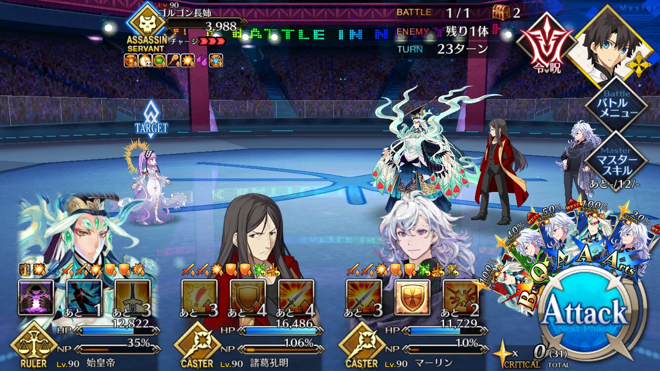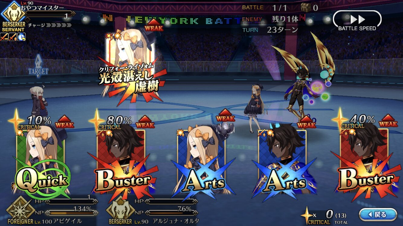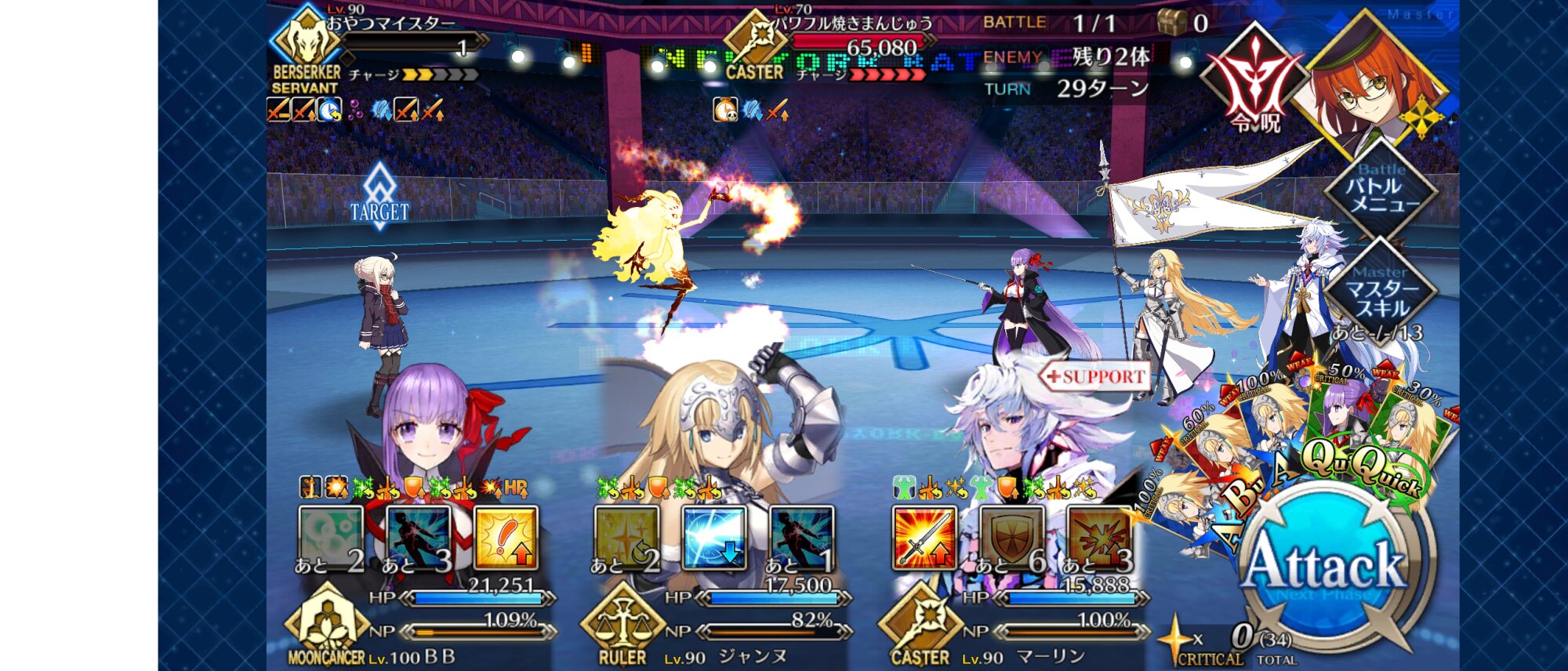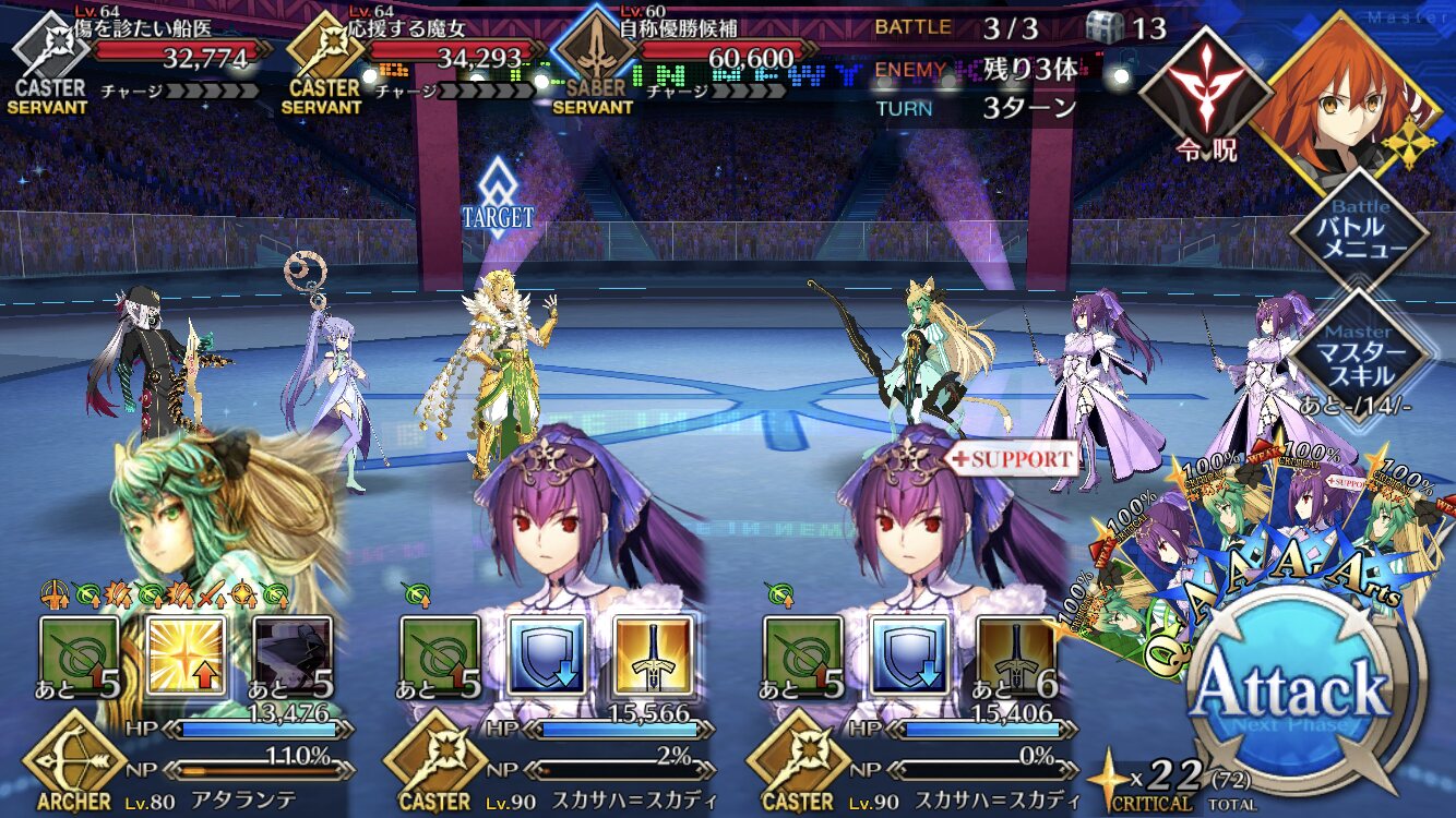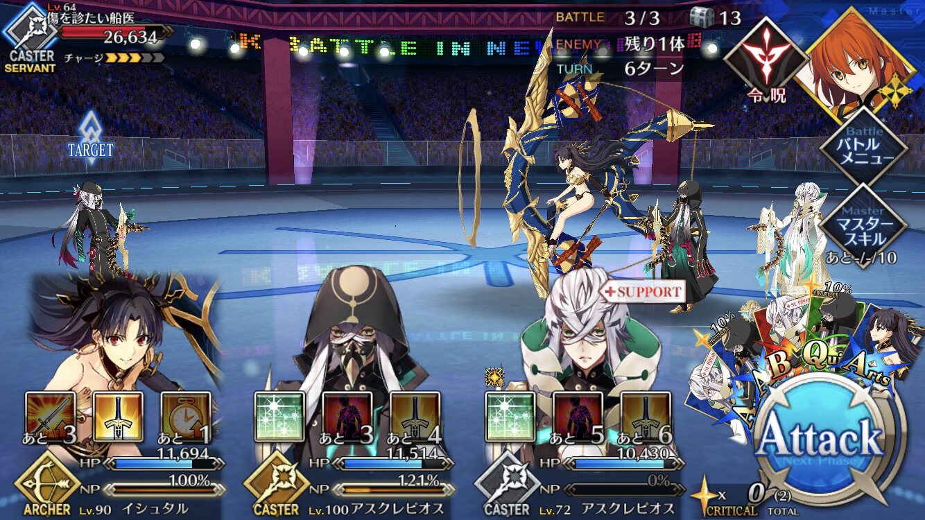 中盤=黒ごま撃破後はタイムリミットが始まるので攻撃力は必要ない。上手くHP1のアタッカーを落とさせ、サポーター3人になれば後はAを選んで宝具を回そう。エンジンがかかれば毎ターン誰かしらの宝具が撃てるはず。