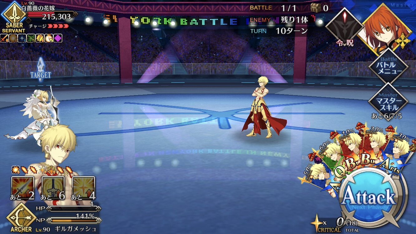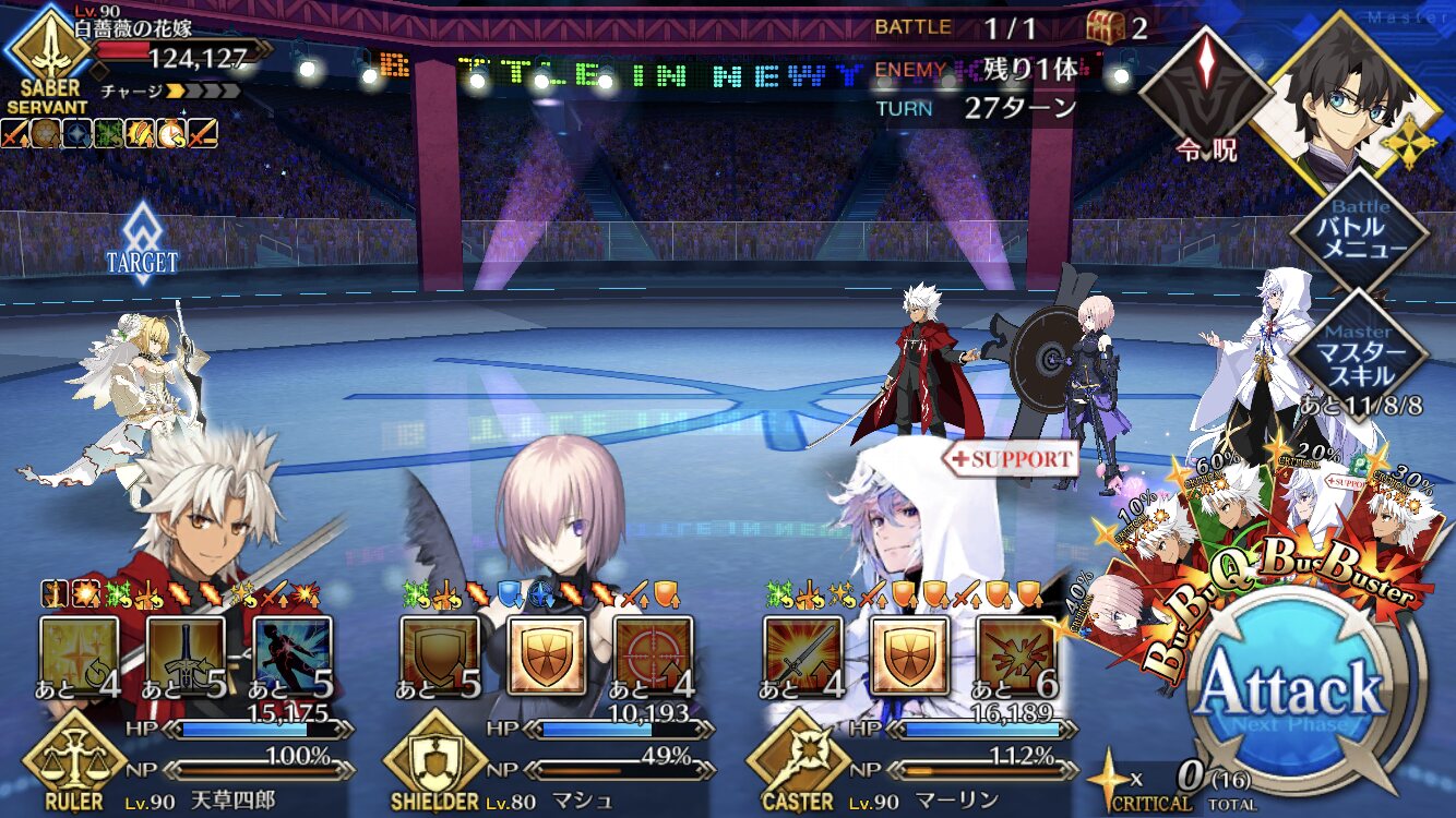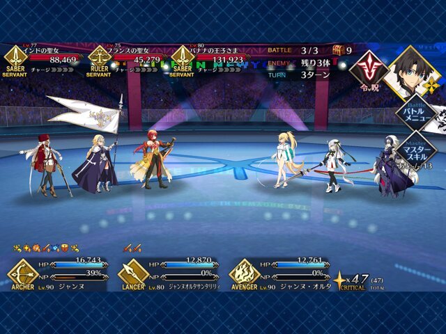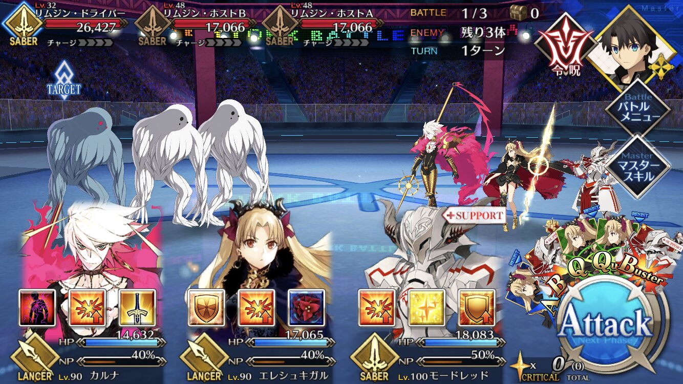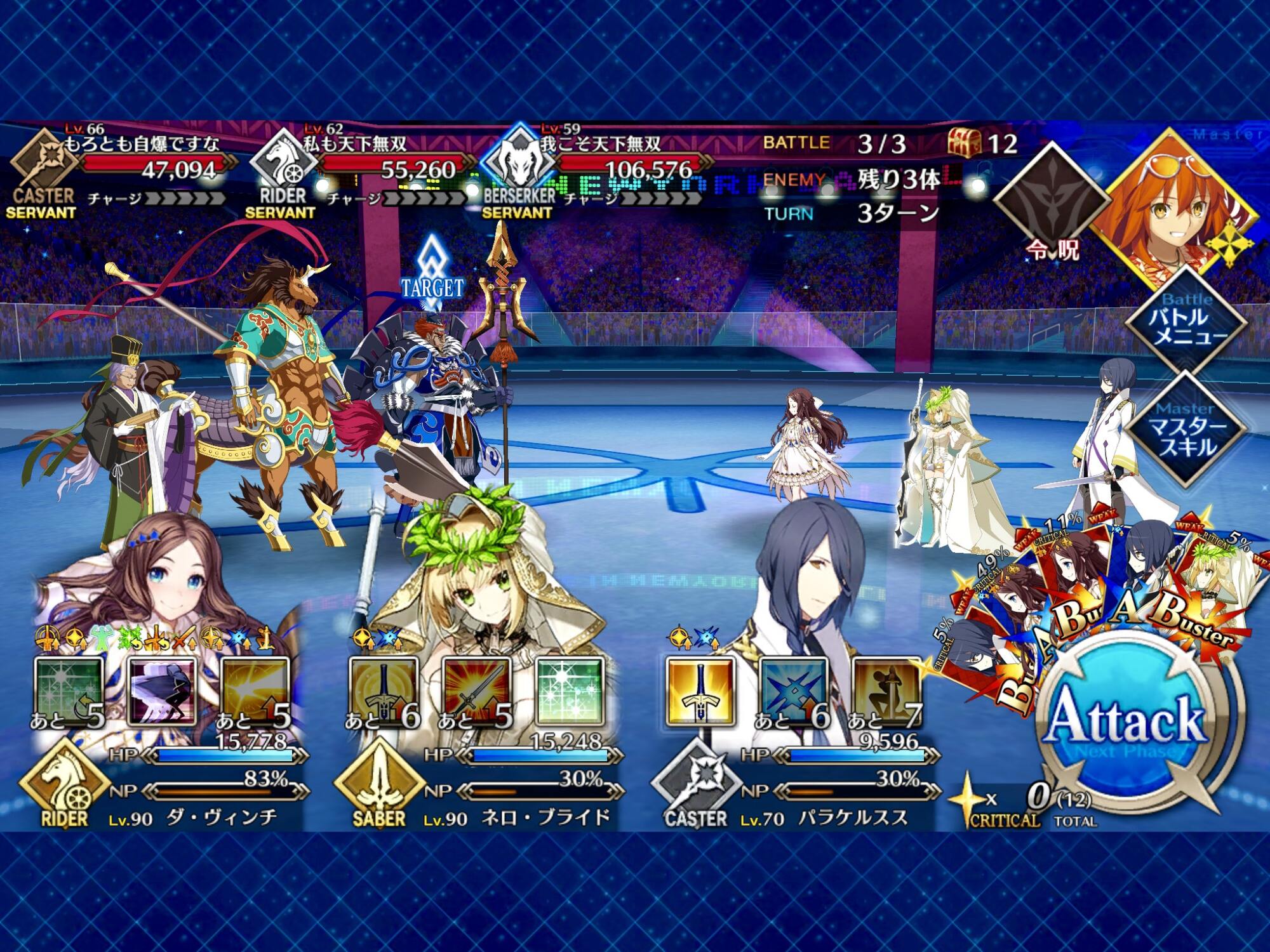 中盤=黒ごま撃破後はタイムリミットが始まるので攻撃力は必要ない。上手くHP1のアタッカーを落とさせ、サポーター3人になれば後はAを選んで宝具を回そう。エンジンがかかれば毎ターン誰かしらの宝具が撃てるはず。