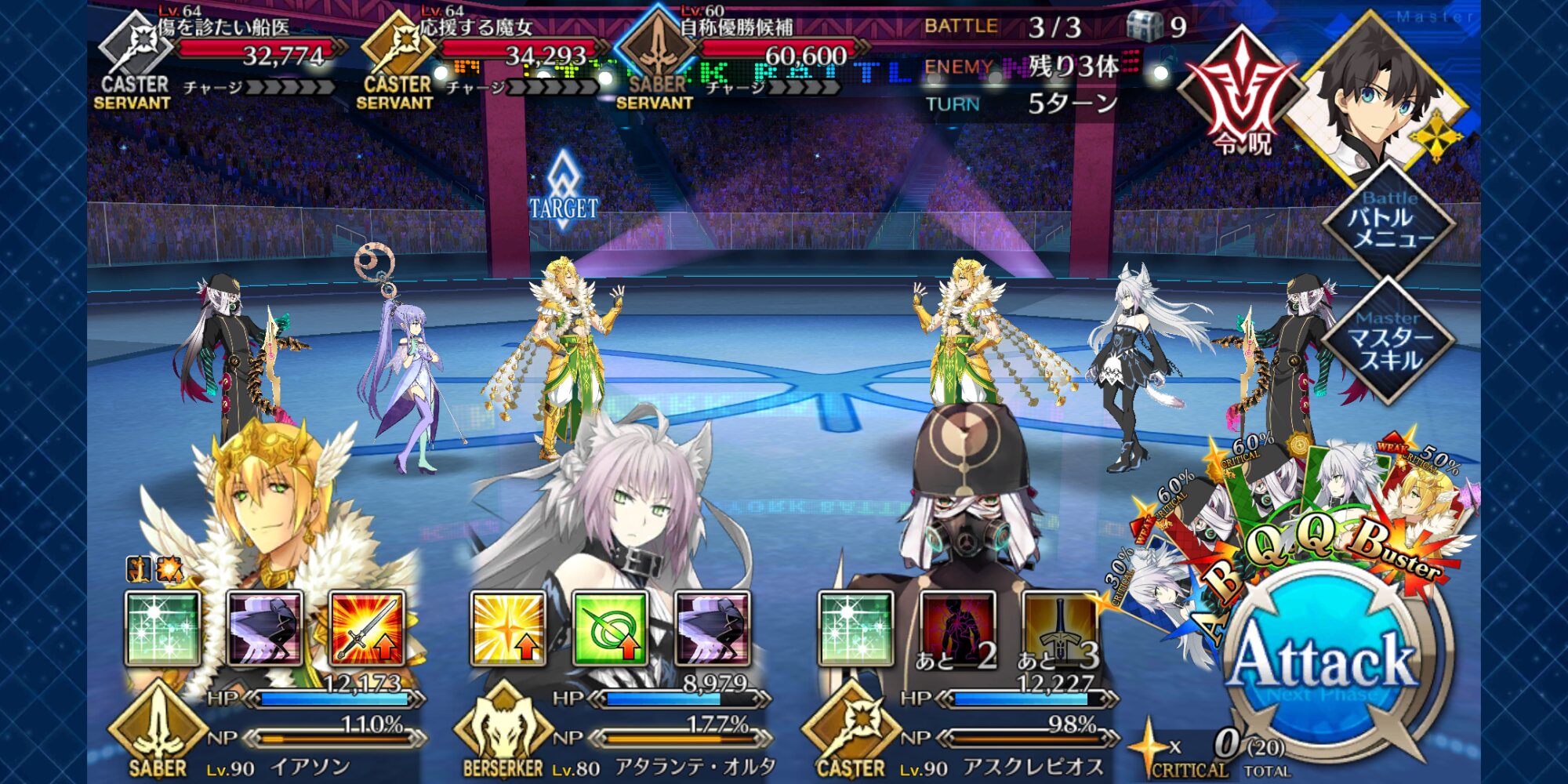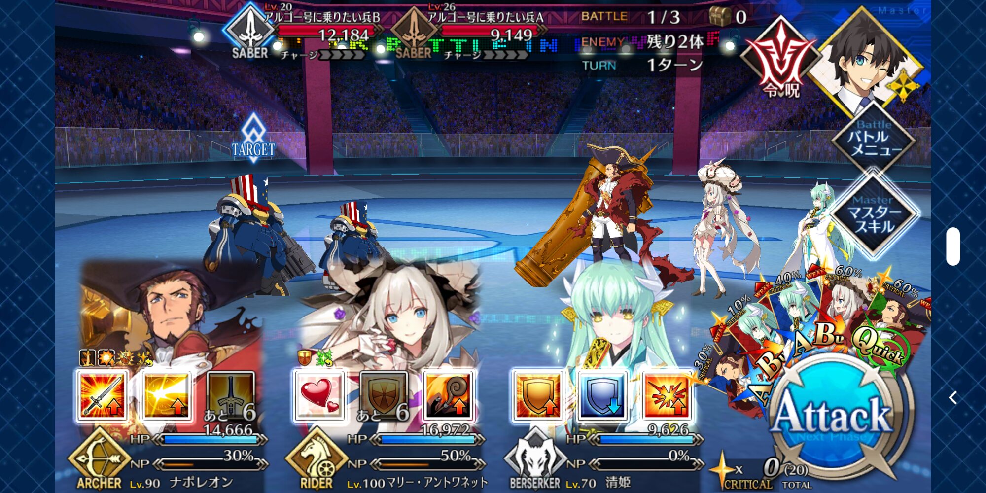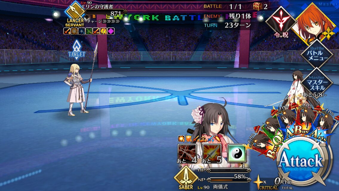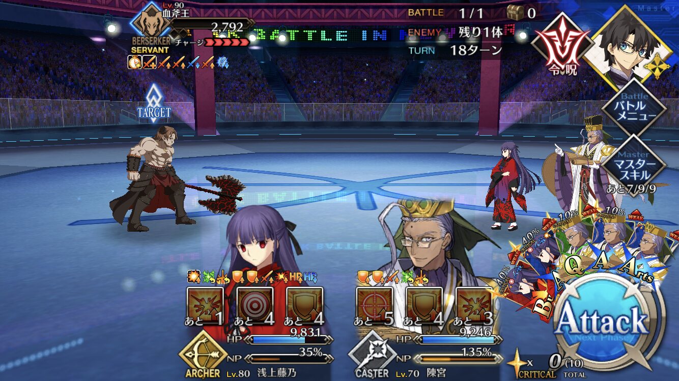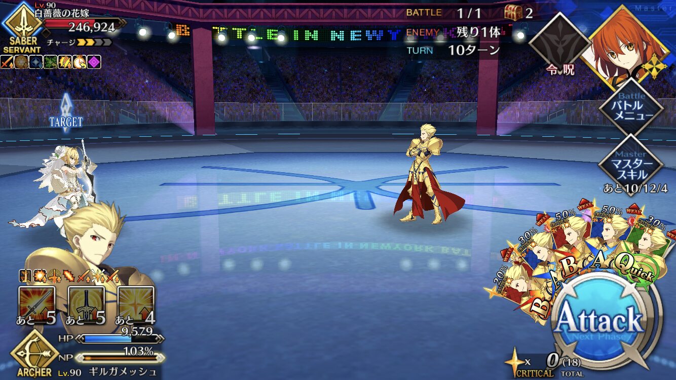 中盤=黒ごま撃破後はタイムリミットが始まるので攻撃力は必要ない。上手くHP1のアタッカーを落とさせ、サポーター3人になれば後はAを選んで宝具を回そう。エンジンがかかれば毎ターン誰かしらの宝具が撃てるはず。