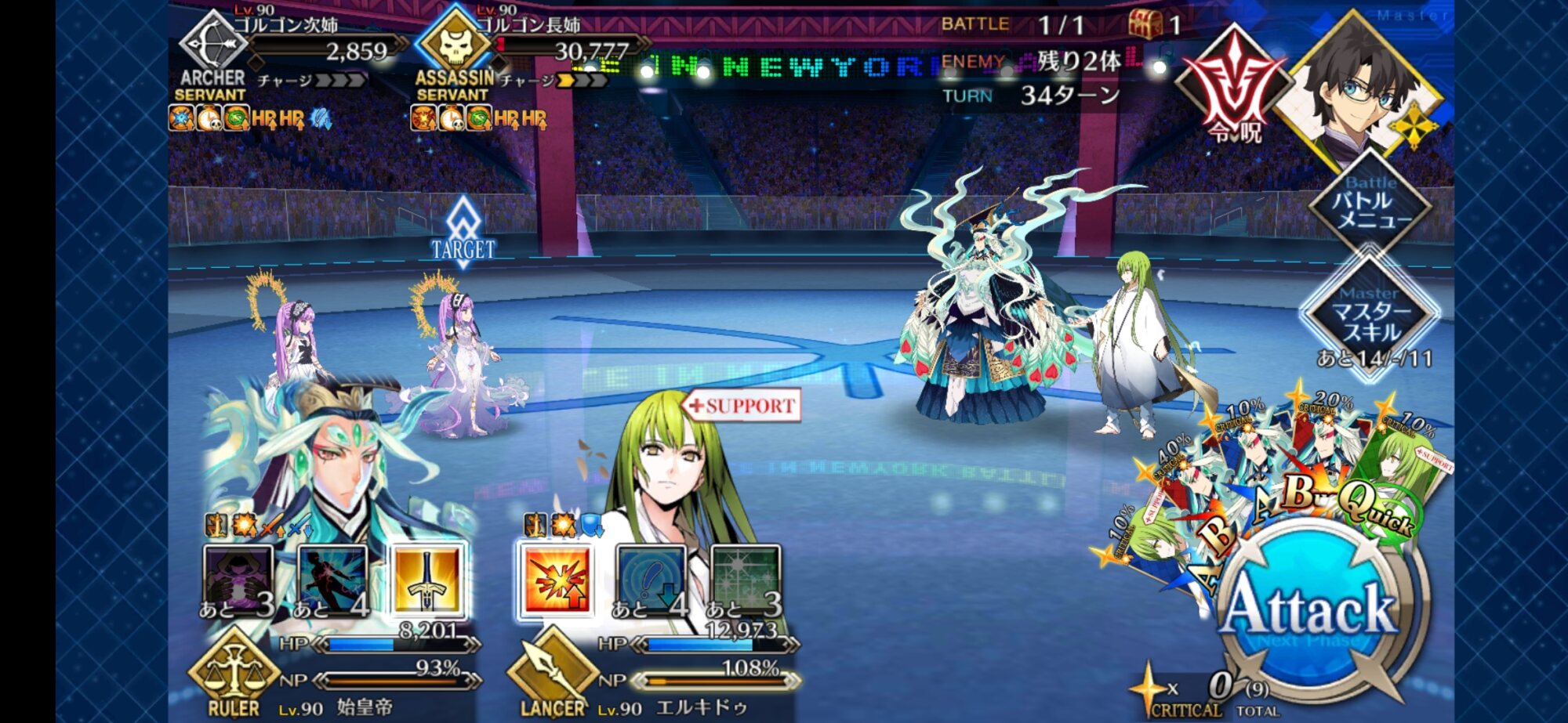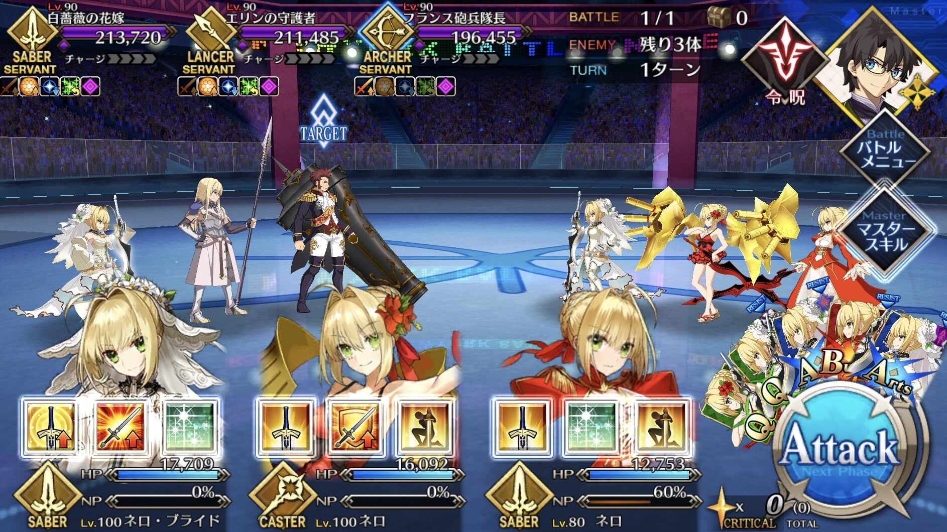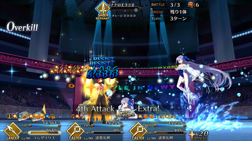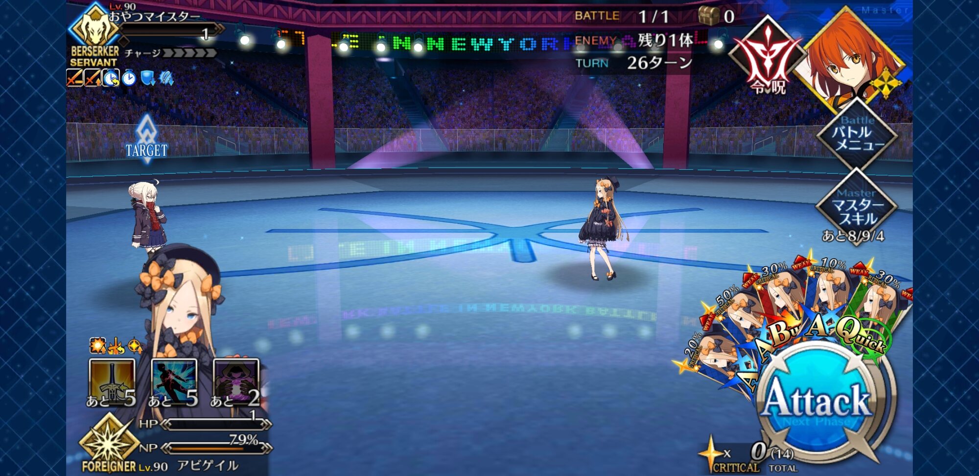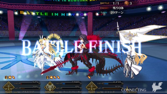 中盤=黒ごま撃破後はタイムリミットが始まるので攻撃力は必要ない。上手くHP1のアタッカーを落とさせ、サポーター3人になれば後はAを選んで宝具を回そう。エンジンがかかれば毎ターン誰かしらの宝具が撃てるはず。