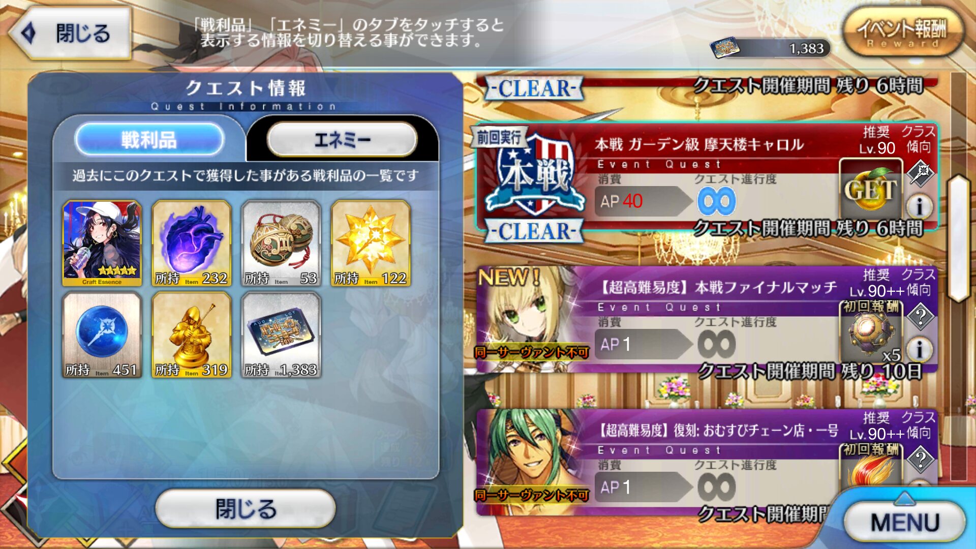 クジ換算で約500000個、箱換算で約800箱上の経験談見てると礼装のドロ率は1%より高そう