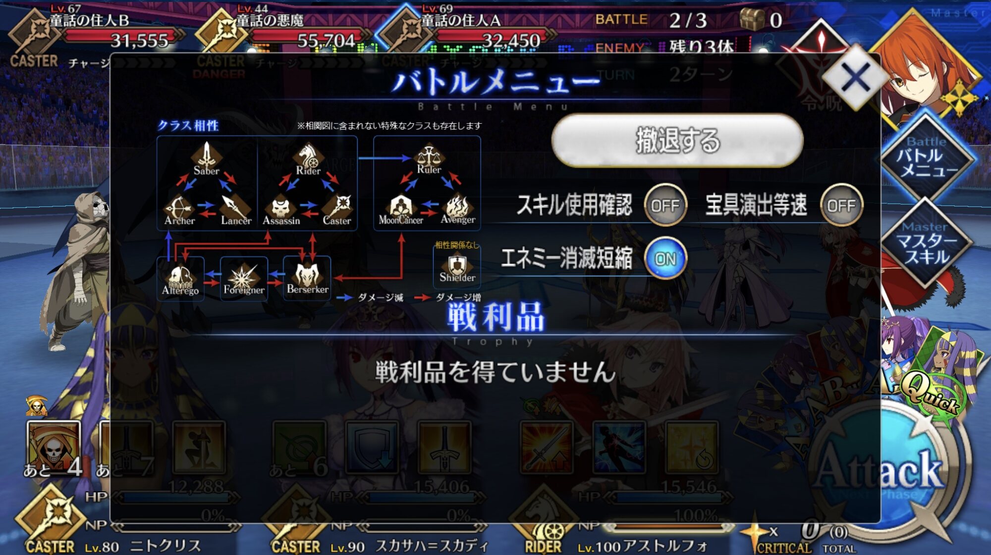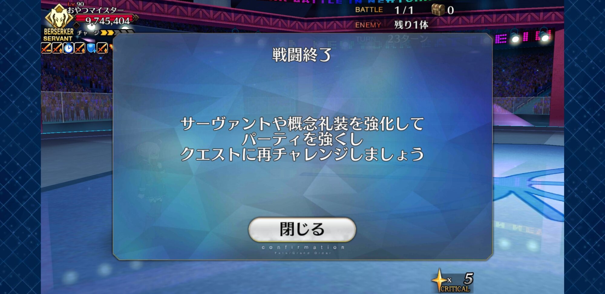 チャージ増加お菓子をえっちゃんに食べさせてマーリンの幻術を早めに使用(クリ減少)