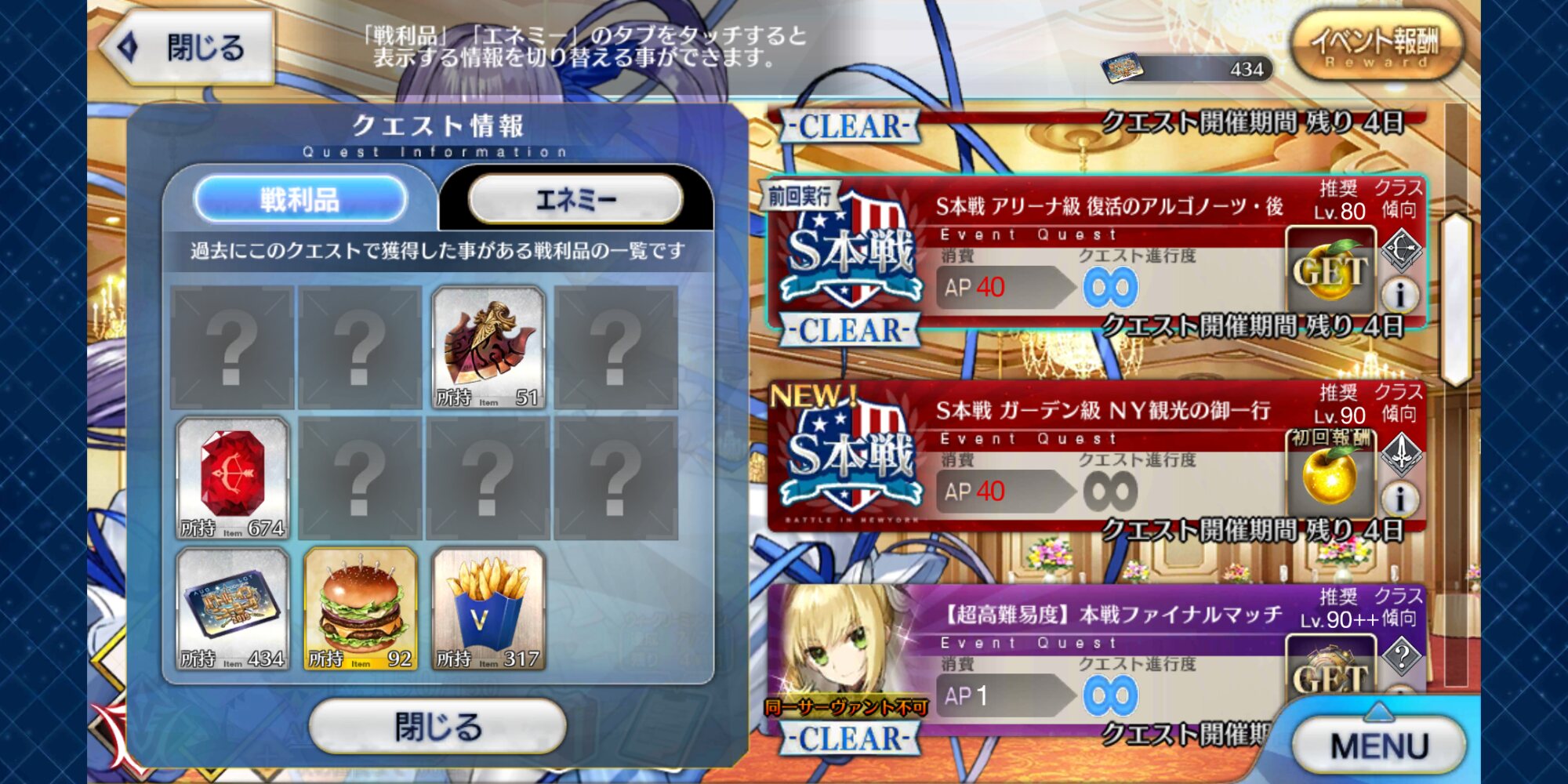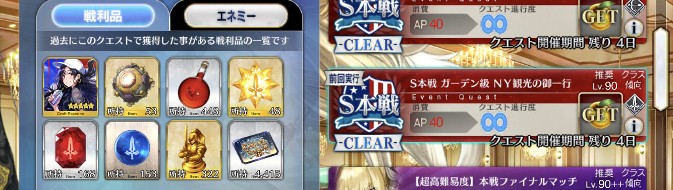 6積みでやってたが100箱行く前には11枚落ちたべ。えっ様は1ゲージをXで宝具ワンパン→陳宮で生贄&自身スケゴで退場→死霊魔術持たせたスカディマーリン玉藻で耐久運ゲー、後ろにフレジャンヌ添え(未使用)とかいう全くおススメできない戦法使ったなぁ。令呪1画使ったし。
