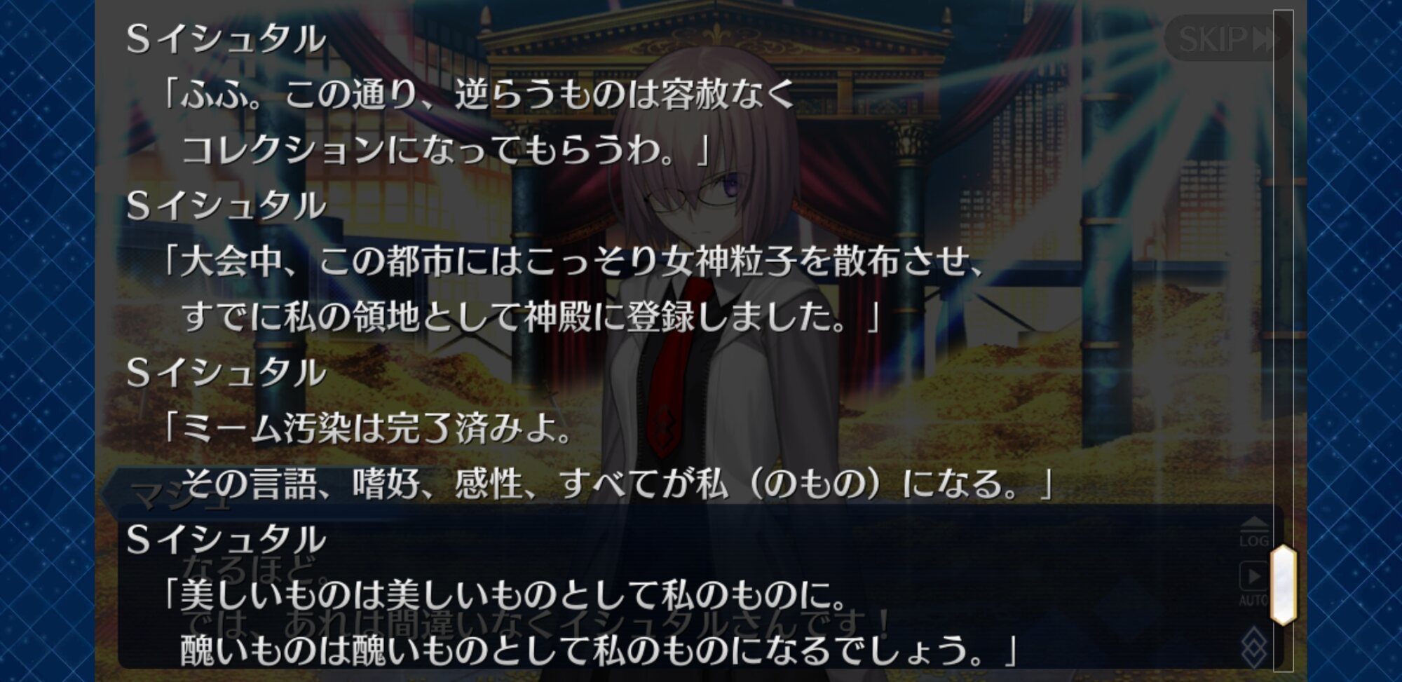観戦していたマリーをかばったデオンとか、勝算がないながらも市民を守ろうとしたガレスちゃん&ブラダマンテと2人を見捨てられなかったヘクおじとかが宝石化ビームくらってたりして…とか思うし、そうして誰かを守ろうとしたサーヴァント達がSイシュタルの欲を満たすためだけに在る宝石に変えられて戦利品のように飾られてたら、英霊の誇りをすごく貶められてる感じがしていいと思うんですよ