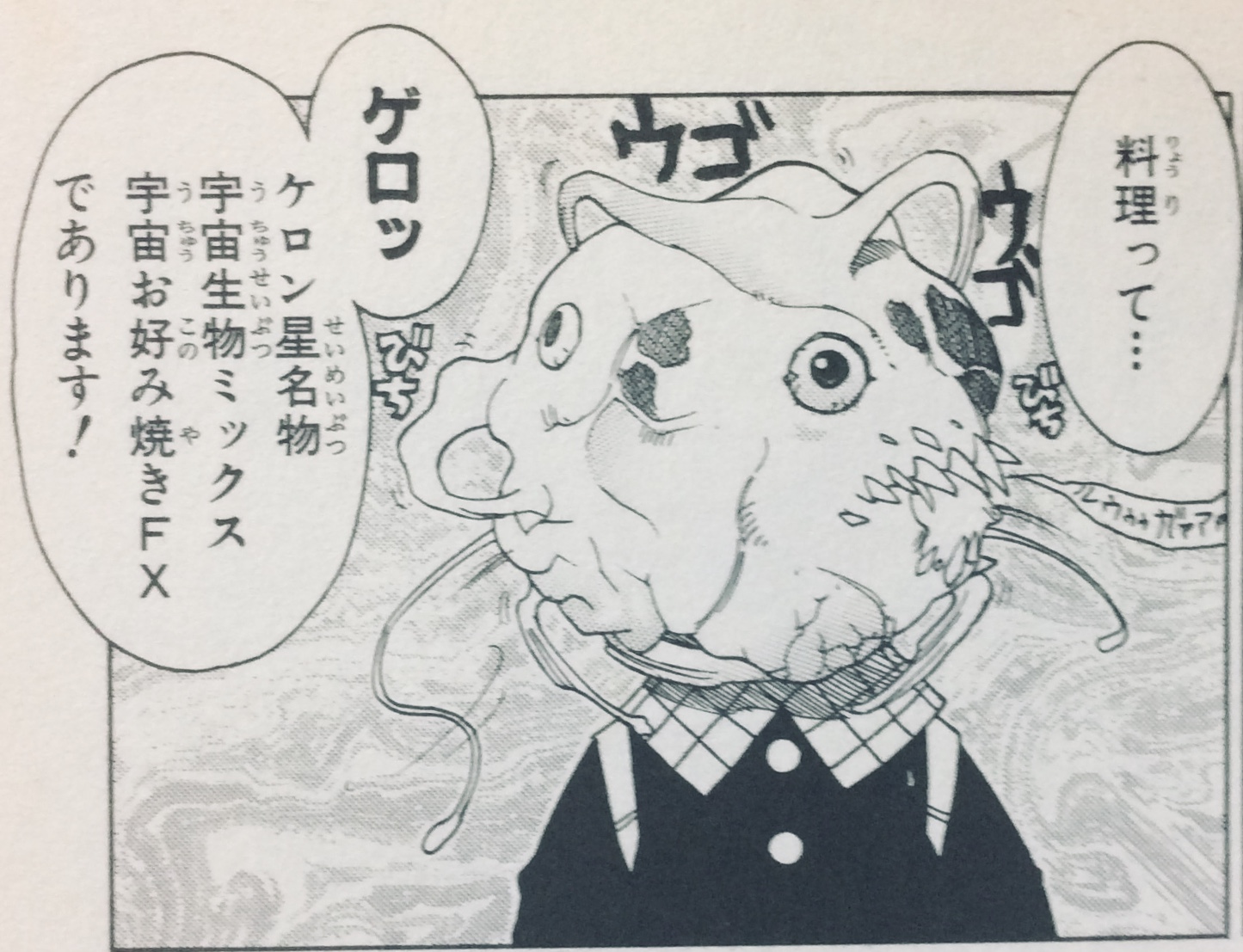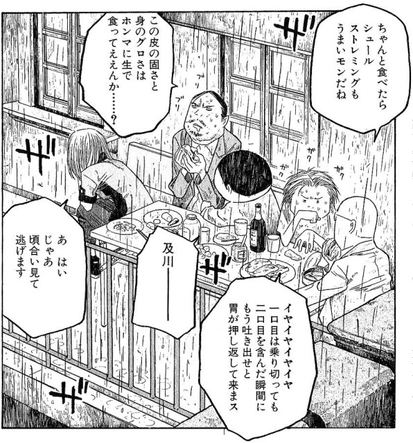 ウソップが仲間入りする直前に村でゾロが魚の骨が喉に刺さって取っていたルフィを見て「喉を鍛えねえから骨が刺さるんだ」ってコメント残したり、ナミが骨だけの魚を指して「普通魚ってのは食べたらこうなるもんなのよ」みたいな台詞を言っている辺り、あるいは魚を文字通り丸ごと食ってる可能性があったり・・・飯テロといえば画像は準備出来なかったけど異世界居酒屋のぶかな?