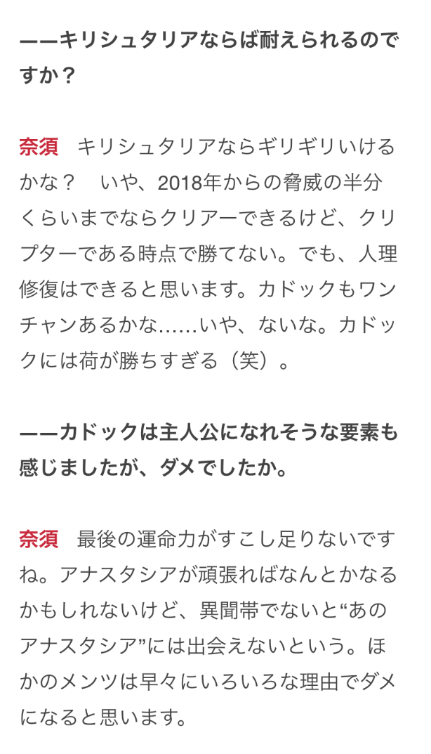 前にもいったけどぐだってこれが終わった後は痛覚残留の後のふじのんみたいに、他者を殺、害した罪を背負うことになるからな。もちろんそれはふじのんの罪とは違い生きていく以上しなければならないものだし、誰かがとがめることでもない。でもぐだはやったことを受け止める以上はこの事をどうするかは一生の課題になるだろうね>>953