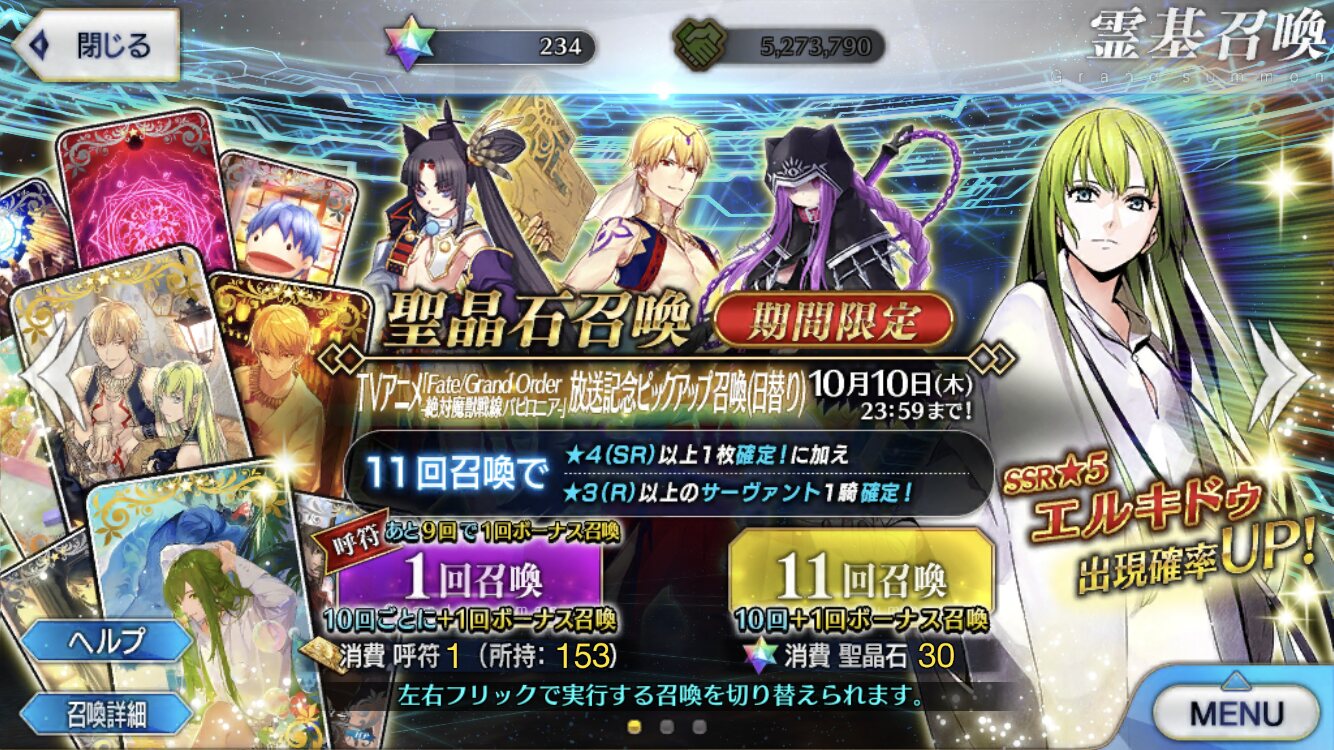 6時までによくてよ10でエルキドゥガチャ行ってくるわ!見事エルキドゥとすり抜け項羽様をお迎えしてやるから首洗って待ってなさい!>>70