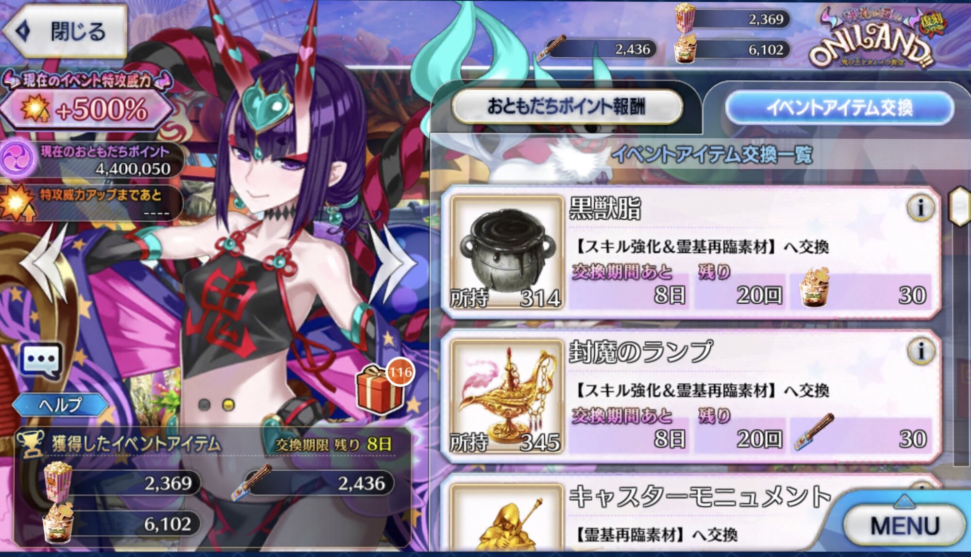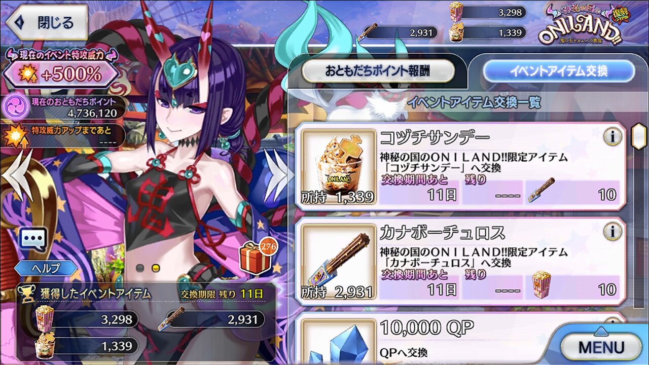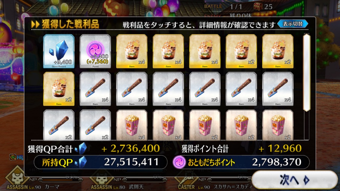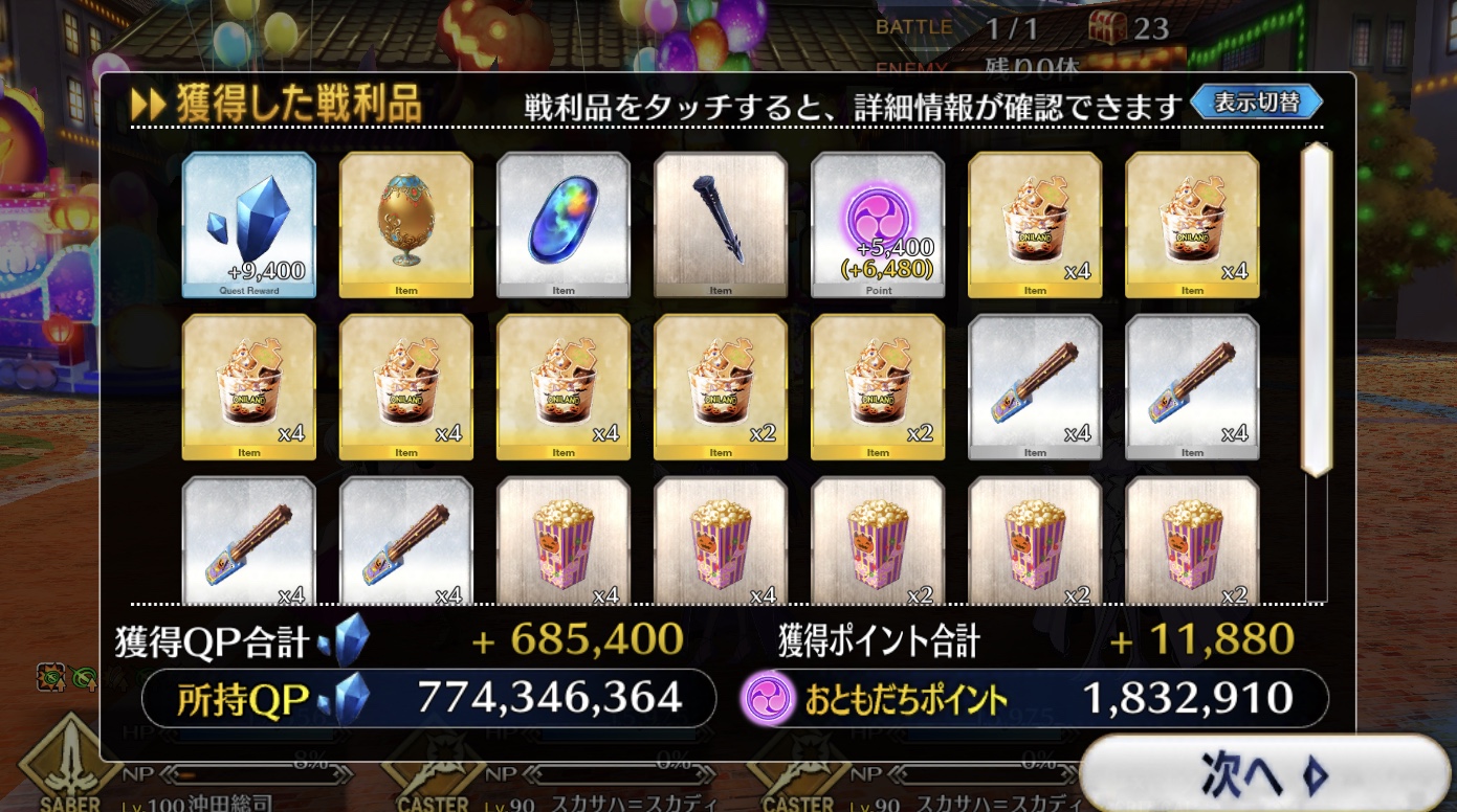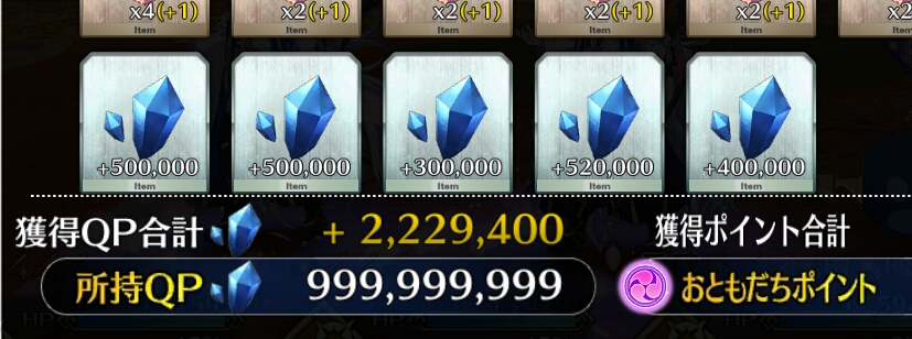 ボーナス礼装多めで銀と銅のアイテム交換も大方終わり。ポイントは100万超えた。