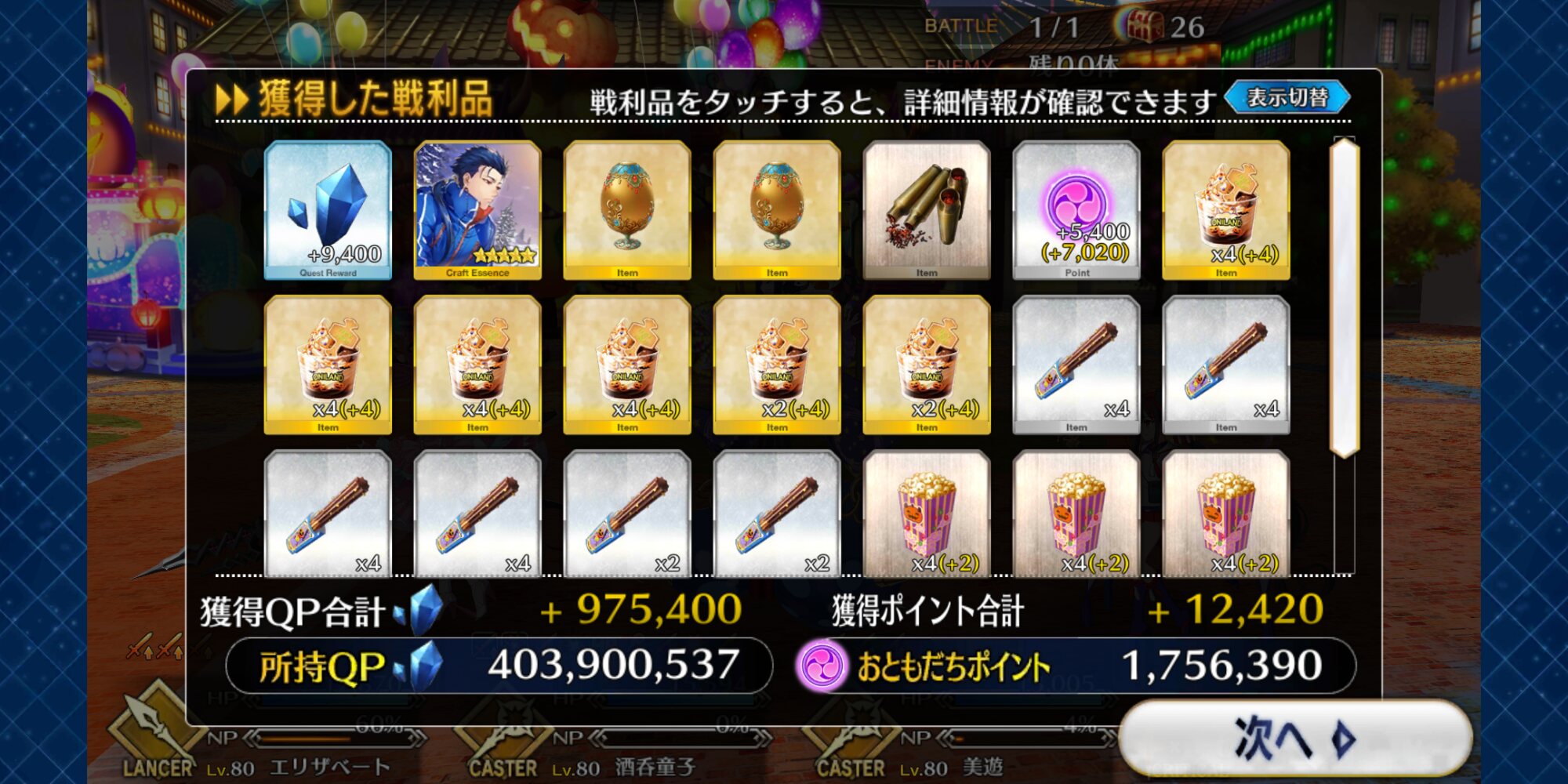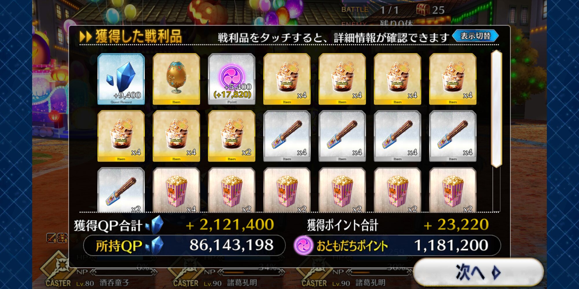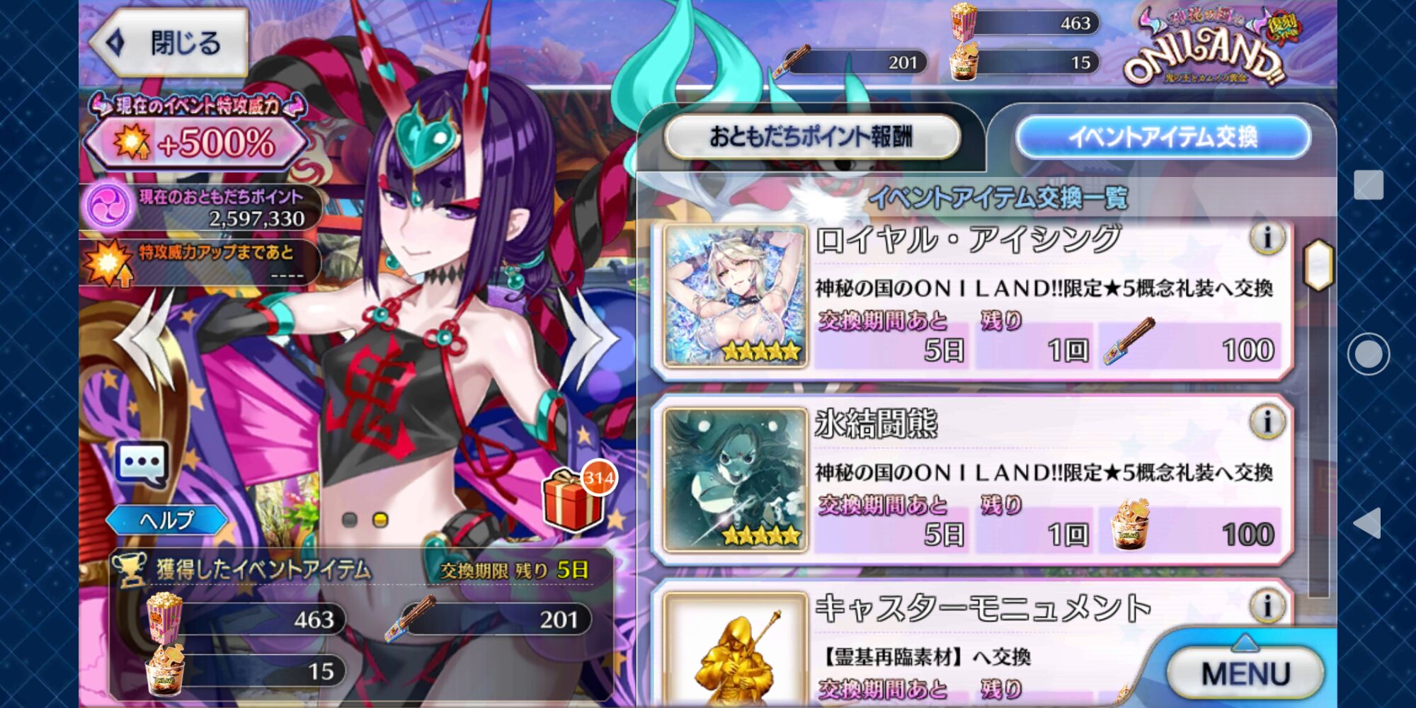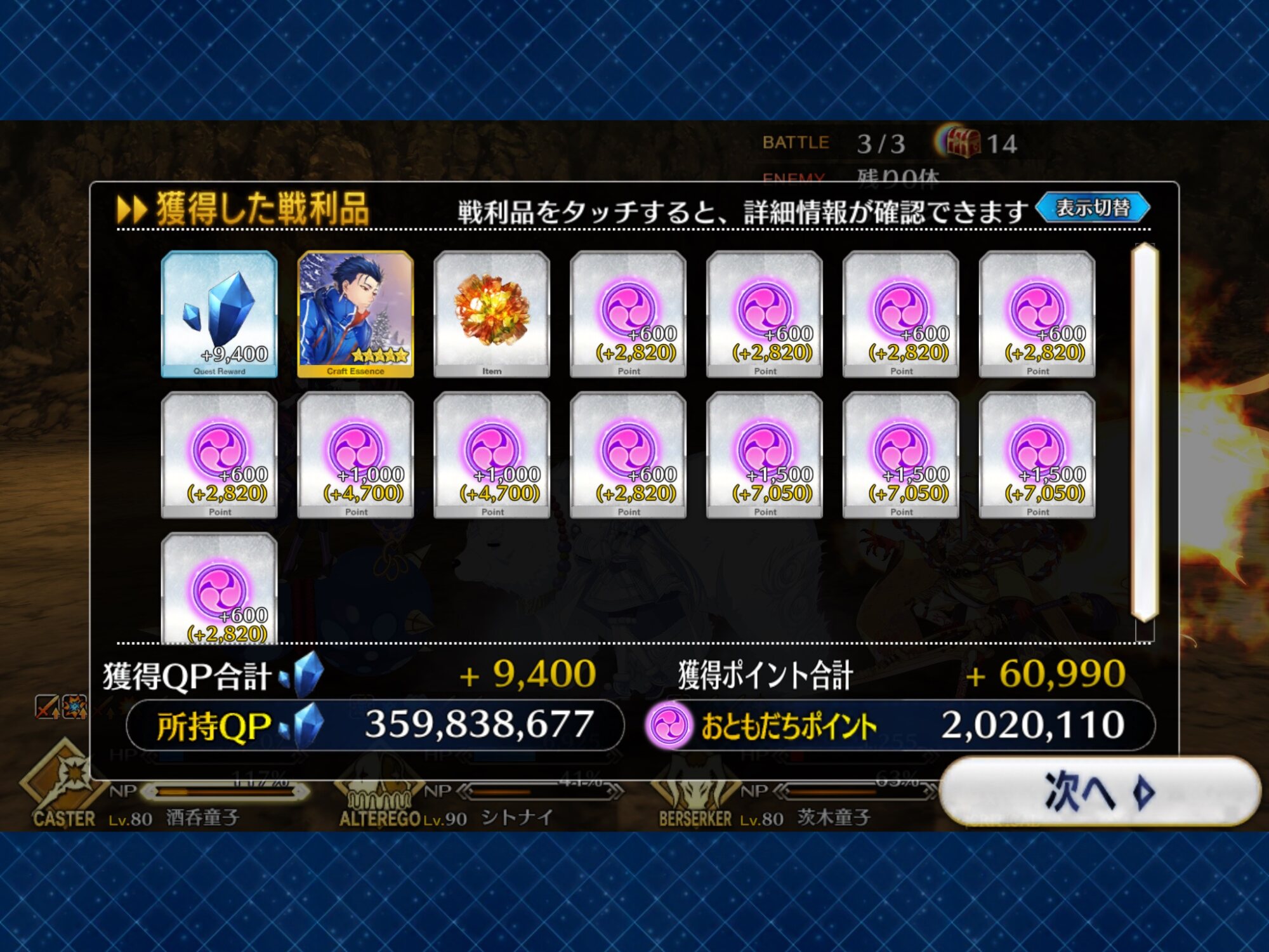 ボーナス礼装多めで銀と銅のアイテム交換も大方終わり。ポイントは100万超えた。
