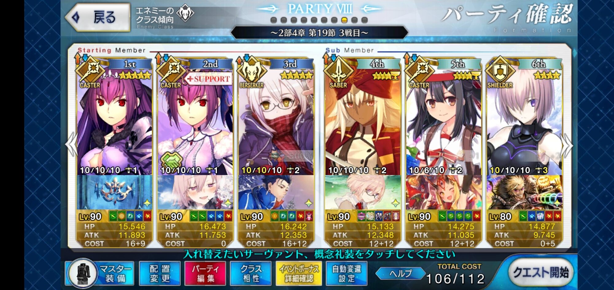 QPになるサンデーは意識的に集めるようにしてます。サポートの出番無くこのパーティと戦闘服でいけたな