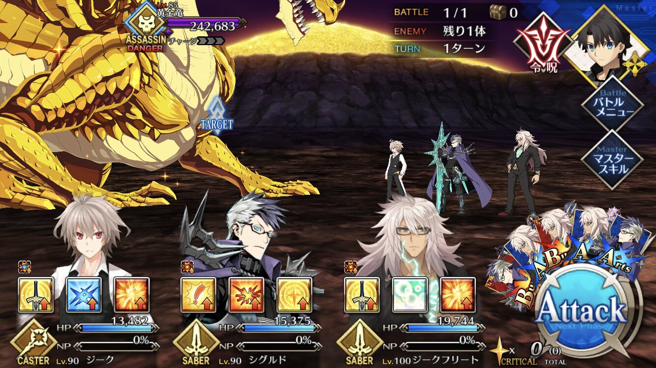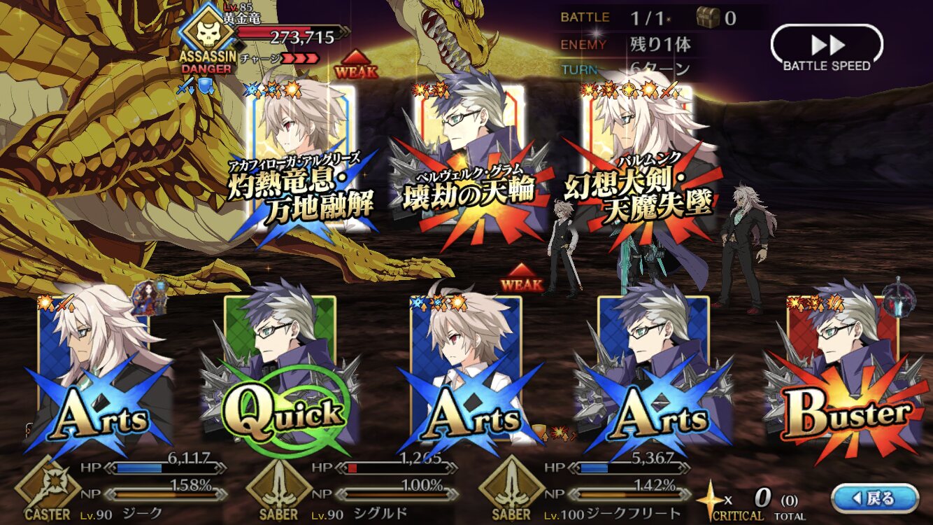 それはそうと高難易度はまた神ジュナにプララヤしてもらった……しゅごい……黄金竜が軟弱なせいで、シグルドとジークフリートと護法少女とバーサーカーの特攻礼装付き宝具を全部叩き込もうとしたらドラゴンスレイヤー組の宝具同時で1ゲージ飛んでその後のバスター3,4発で倒しちゃった……