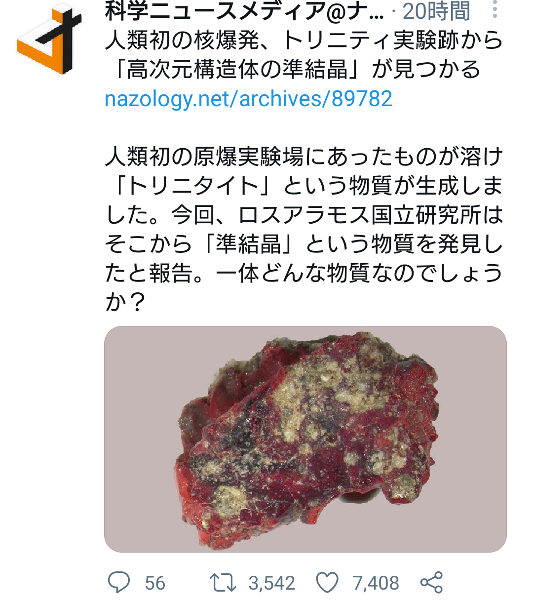 「人類最初の核実験跡地から発見された、余剰次元の構造も含めて計算しないと説明できない高次元結晶」なんだけども。