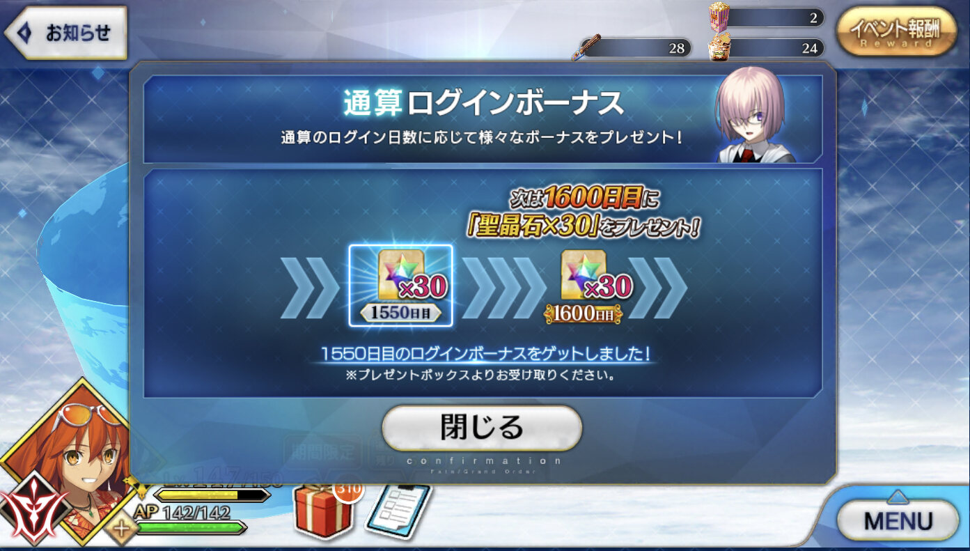 悪いと思ったのかfgoでは凄まじい速さで宝具レベル5になったけどすでに調整ミスってAP溢れまくって悔しがってたから、逆に延長のおかげで配られるであろう石であれリンゴであれもらえることでプラマイゼロどころかプラスだから、逆に嬉しい展開で我、歓喜。