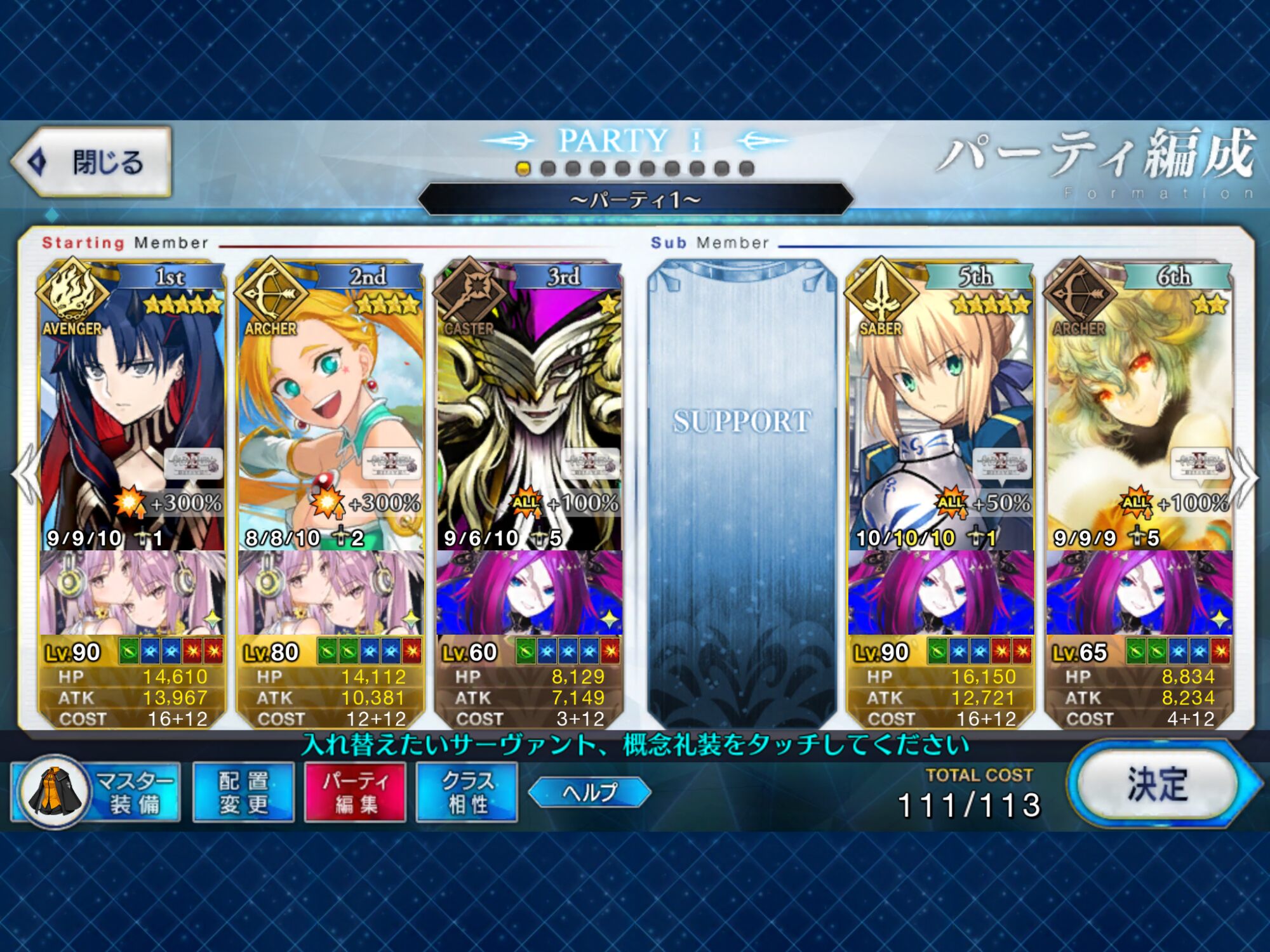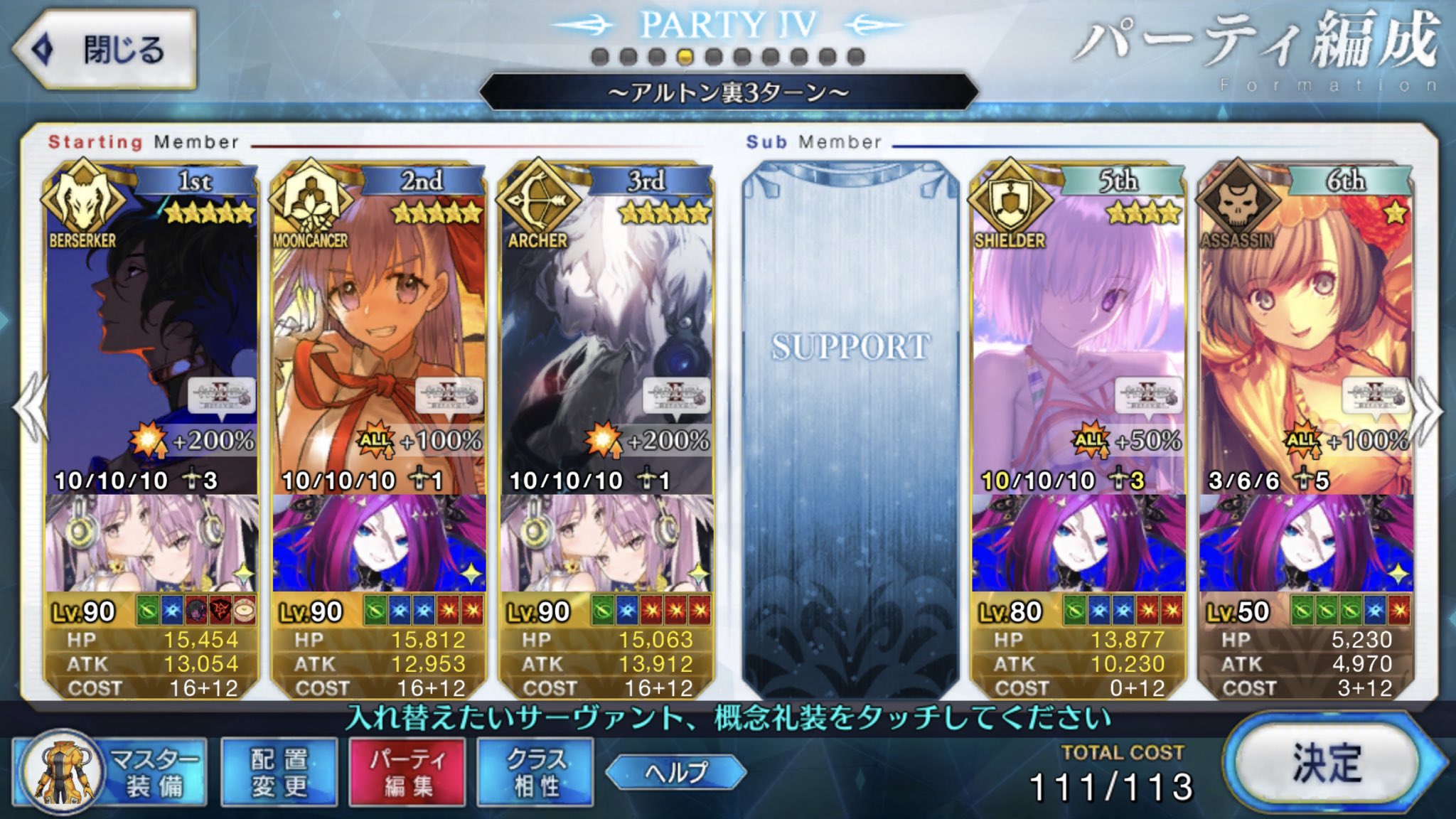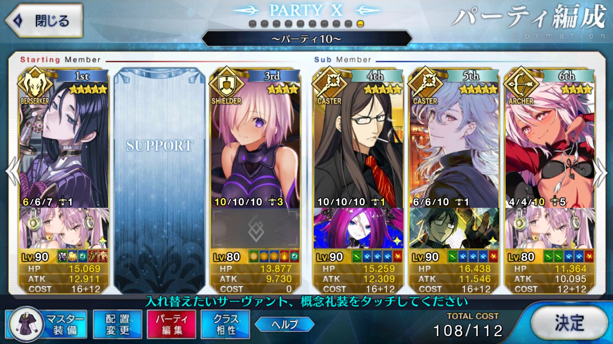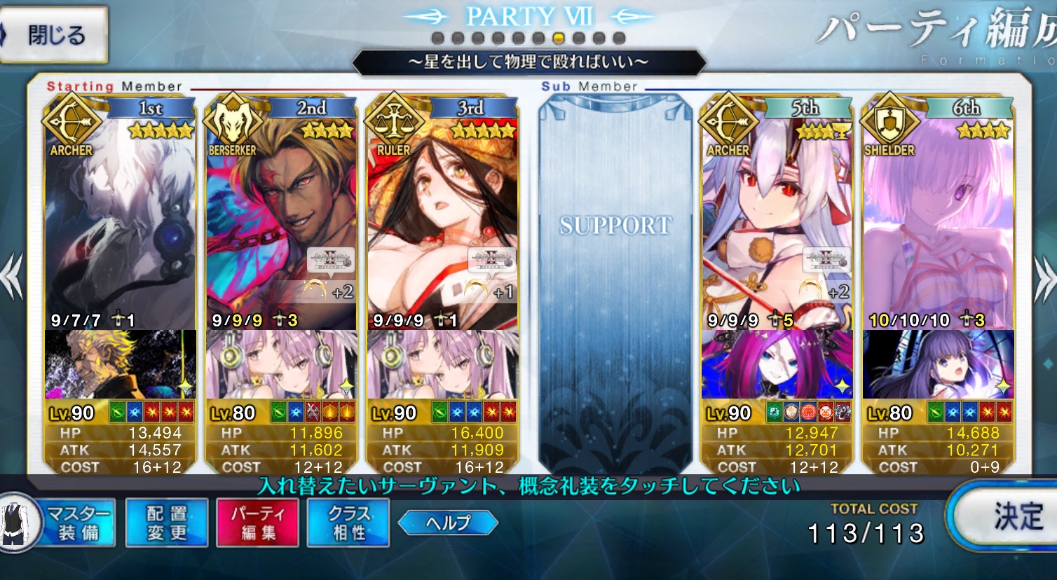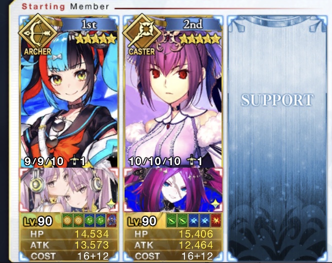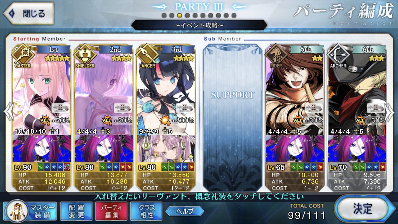 ゲオルギオス枠は別の鯖にしてた(たしか孔明だったような)けどこれだとメインアタッカーがすぐ倒れるのでゲオルギオスにしてマシュ撤退後の盾役やって貰ってます……(オダチェン礼装もゲオルギオスと一緒に変更)上から見ていくとダーク・ラウンズはバニー、卑弥呼、キャストリア3人ともスキルMAXが最適なのかな?限定星5、スキルMAXかぁ……
