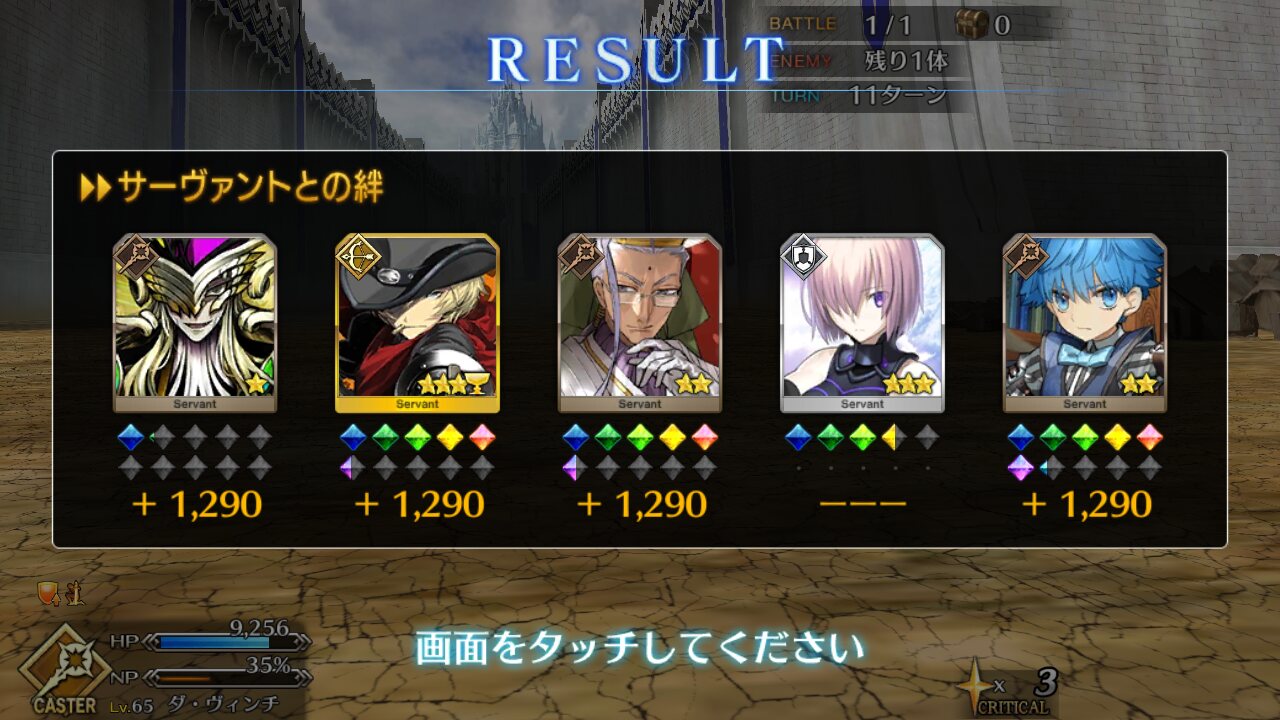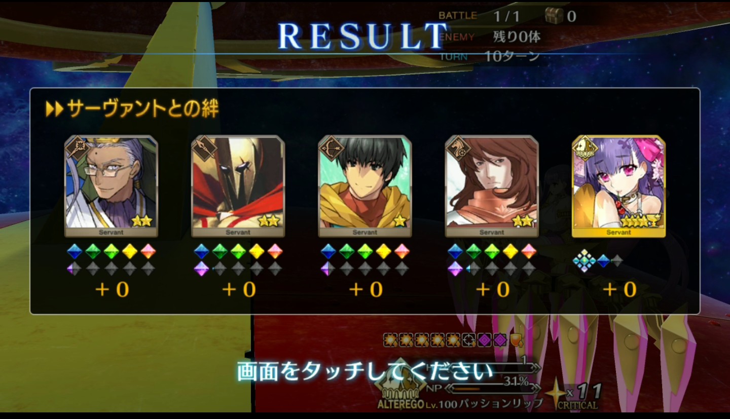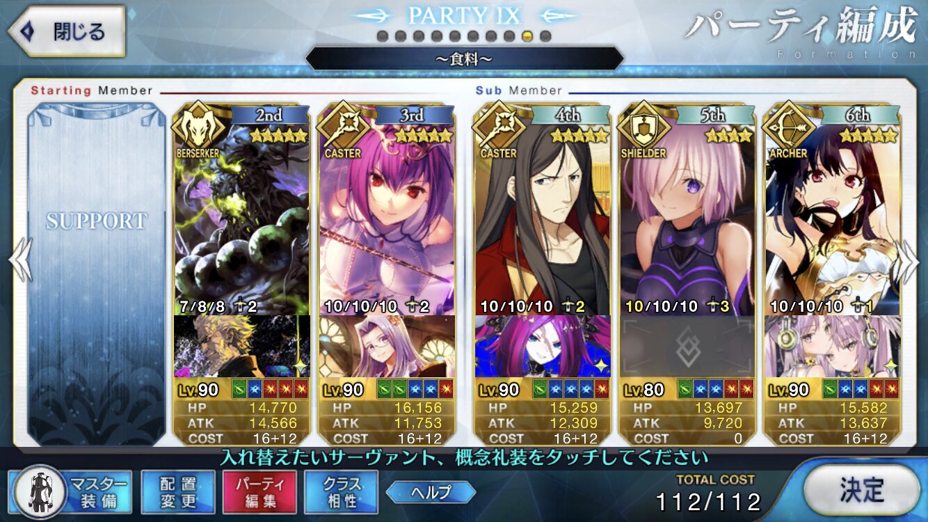 狂のところを種火周回用に凸カレ項羽様にしているだけで後は趣味前回だし。絆レベル10になった記念に絆礼装語り部さんをオールに置いたらその日一番借りられたのは地味に嬉しかったなぁ