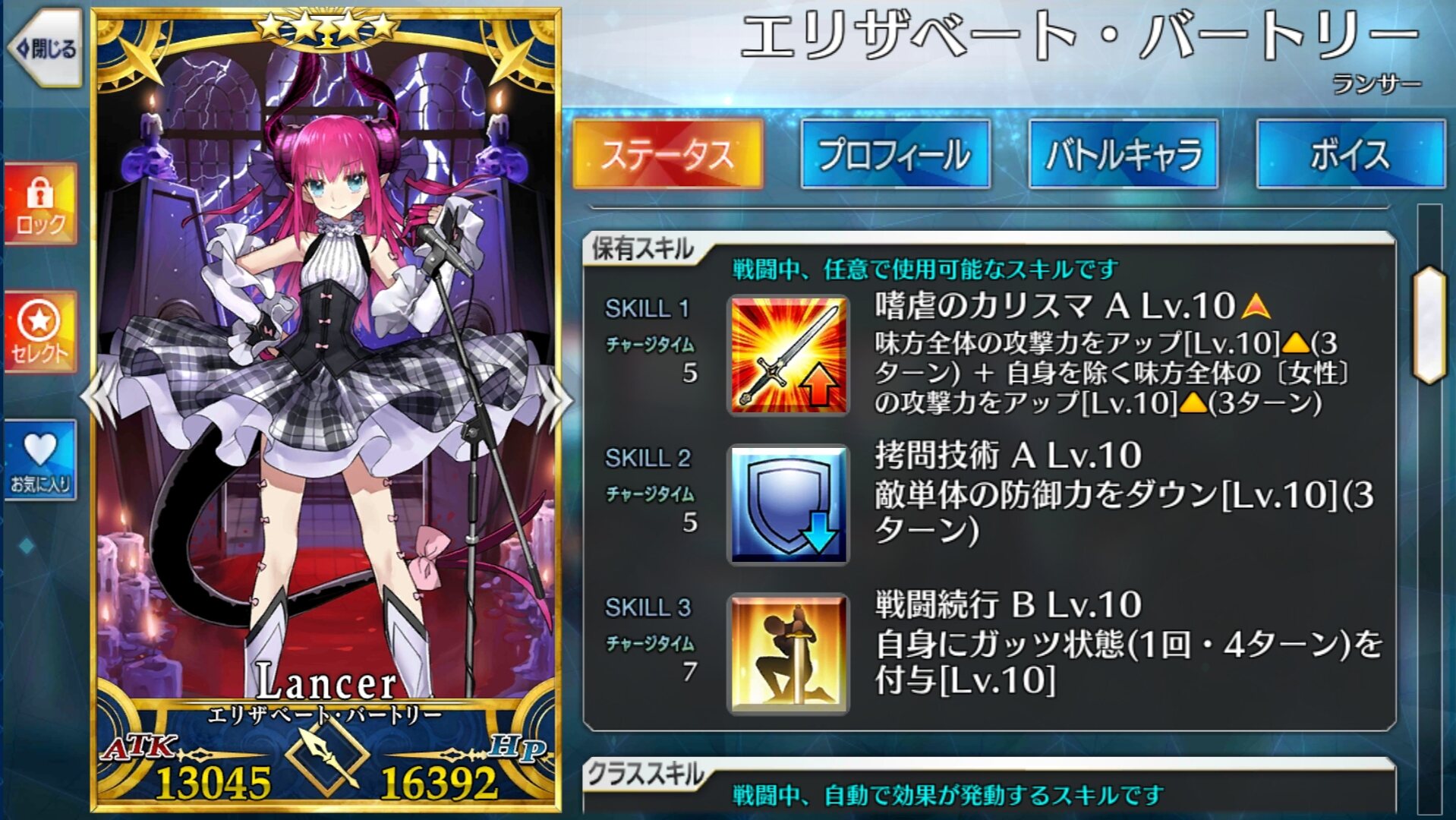 強化クエストをこなすことで味方全体の攻撃力を上げ自身を除く「女性」の攻撃力を更に上げる「嗜虐のカリスマ」(エリちゃん!!)