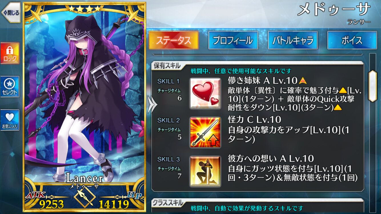 彼女の特徴といえばまず全体宝具アサシンである事!特攻付き宝具ではありますが自己バフもありますのでサポートを怠らなければ無特攻でも威力的にも問題ないと思われます!ライダーの敵に魔性属性が少ないことは逆風となるかもしれませんが、別にどうしてもダメってほどではないのです!普通にいけます!