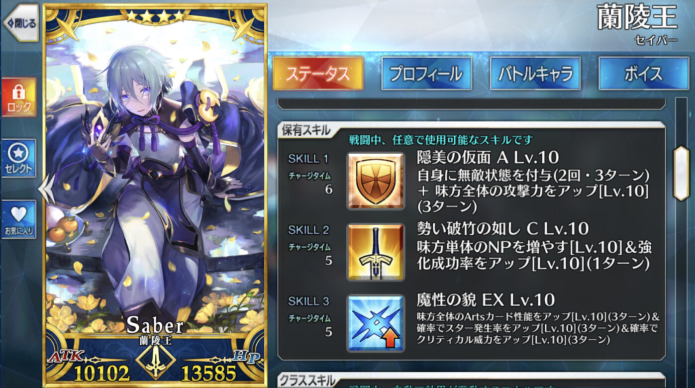 要約すると蘭陵王はいいぞ。Aパでもいいし剣統一パでも活躍できる。オススメパーティはエジソンと玉藻の絶対宝具打たせないマンパだ。これで自分は最強カーマを一回も宝具撃たせず3時間かけて倒した。