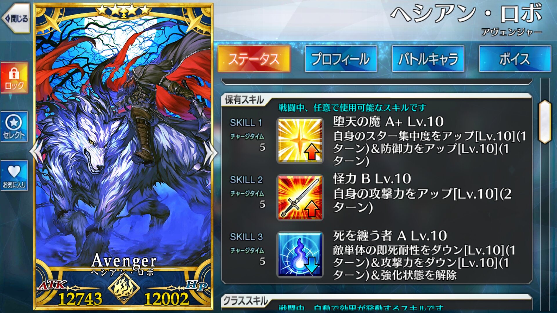 宝具は敵全体に強力な防御無視攻撃+5T呪い付与、強化クエストをこなすと更に強化成功率ダウンがつく(ぼえーーー)