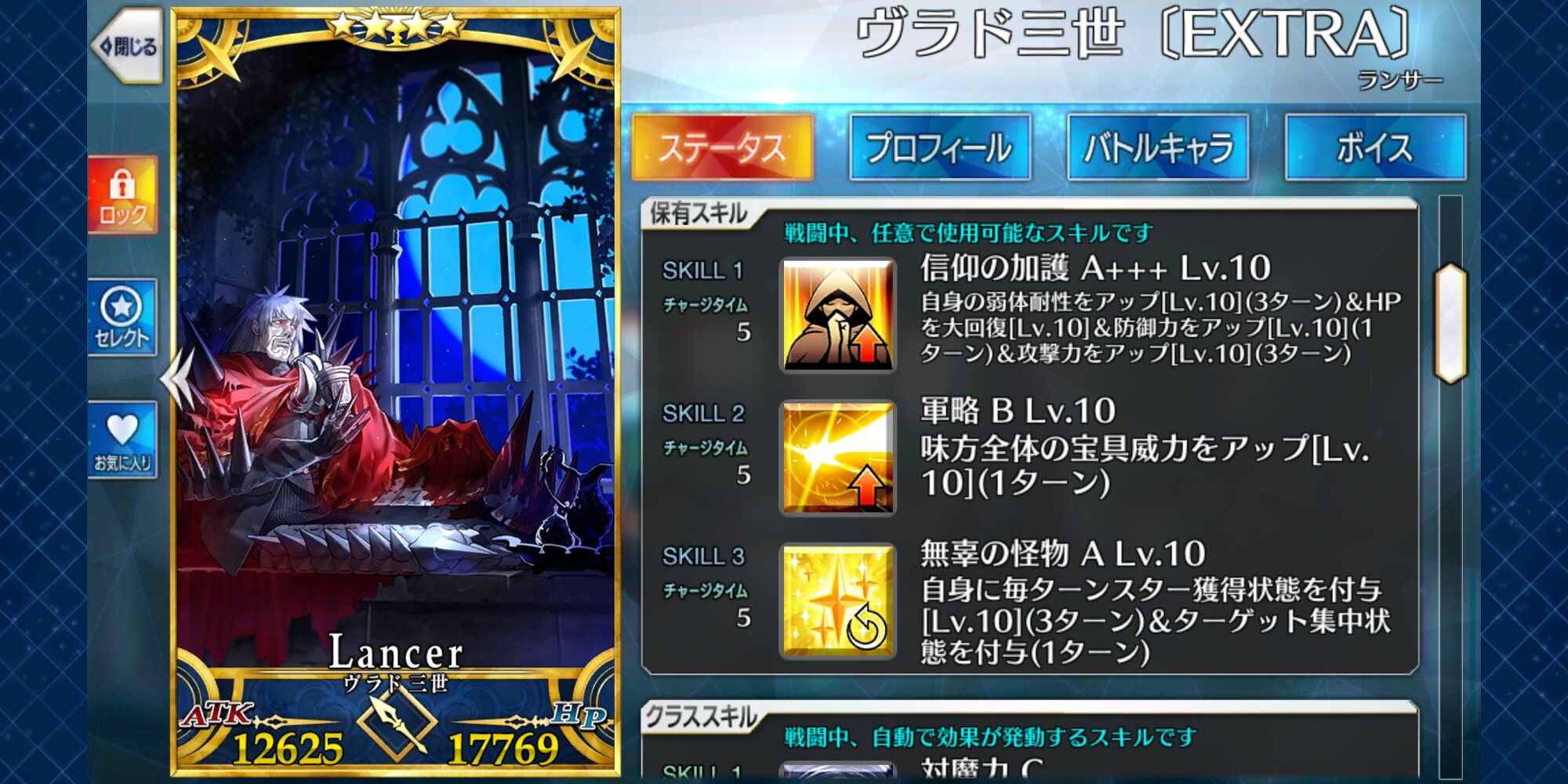 クラススキルは「対魔力A」で弱体耐性が高くランサーでは珍しい「陣地作成B」を持ちA性能は割と優秀となってる(再臨は第二がオススメ)
