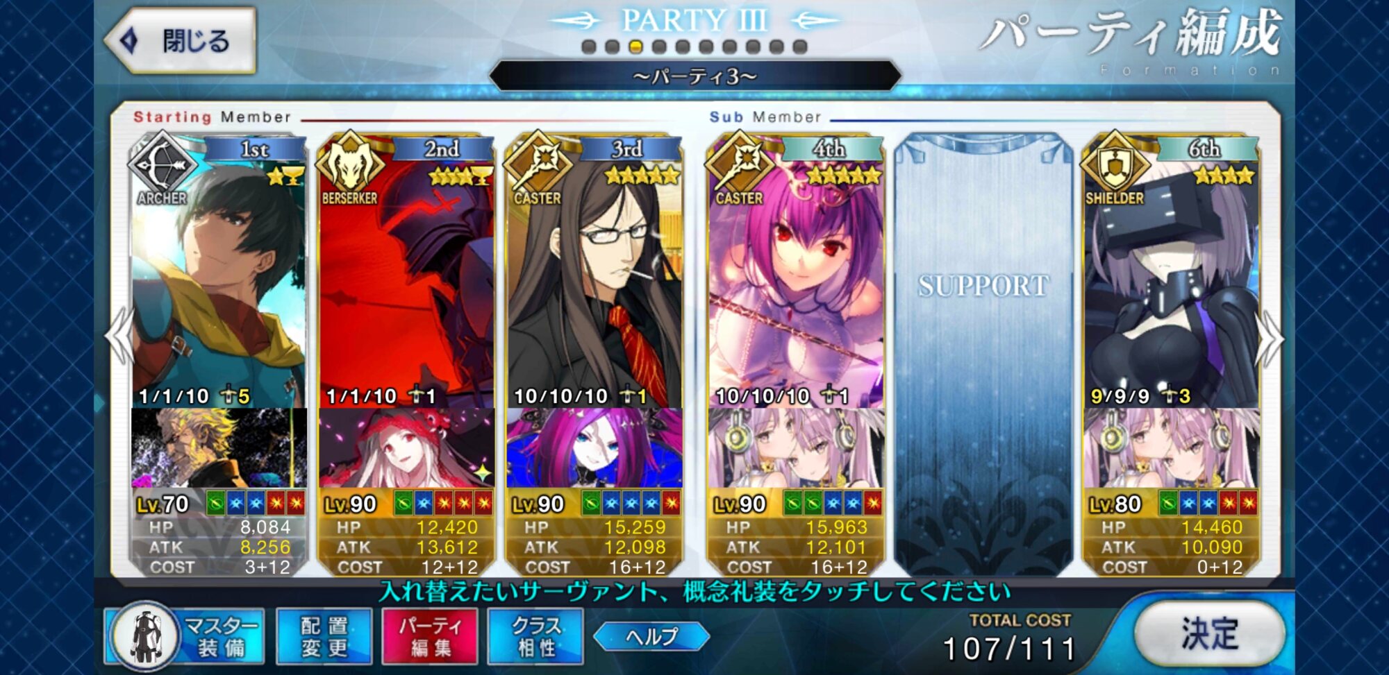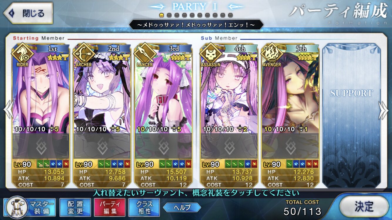 回復は持ってないので、長期戦なら玉藻やアンデルセンと組ませてAパで運用するのがお勧めだけど、どんなパーティでも戦力の底上げができるので弓以外なら組み込みやすいと思う。特に術サポーターを出しにくい対騎にだせるサポーターなのは大きいと思う