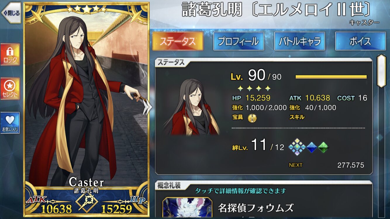 宝具では敵全体にチャージ減少とクリデバフを付与し、味方全体にダメージカットと攻撃バフを付与する。敵の宝具遅延も嬉しいが、ダメージカットは宝具1で500、2で1000となり、宝具が重なるほど効果が実感できるので、既に持ってる人にこそ強くお勧めしたい。もちろん宝具1でも十分仕事するし、攻撃バフはオーバーチャージで効果が上がるので、孔明と宝具チェインして敵を弱体化させつつ味方を強化するのも一興