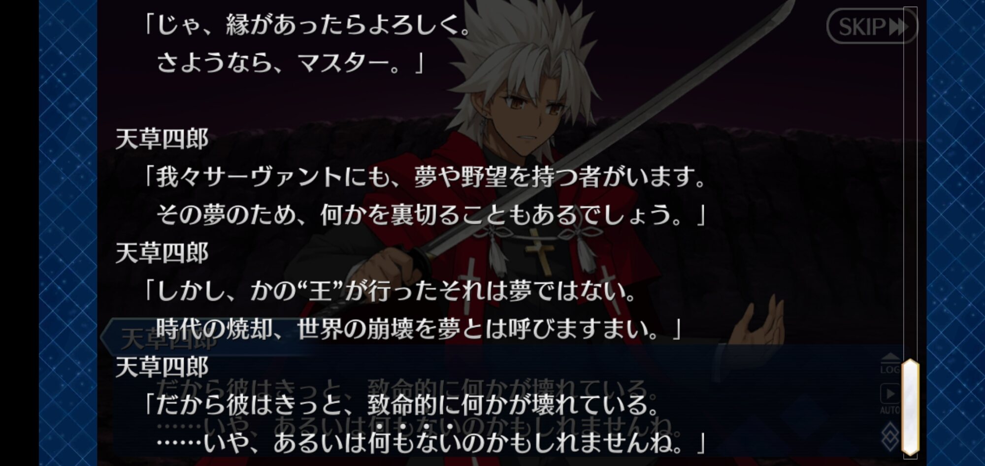 大まかな流れとか礼装受け取った後の反応を見たりとかしているけでシナリオ詳細そのものは見なかったから進むのが怖い…