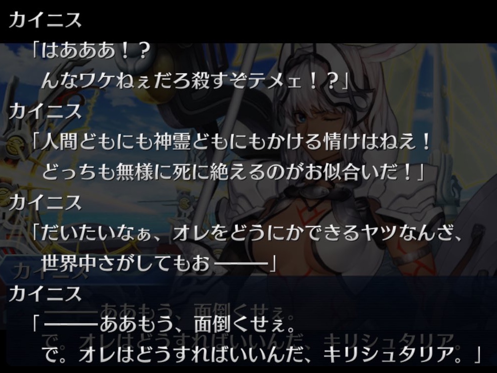 ギアス的なサムシングですかねw早く五章が来ないとキリシュ(桜)タリアとカイニスのこと強姦被害者縁召喚って呼ぶぞ