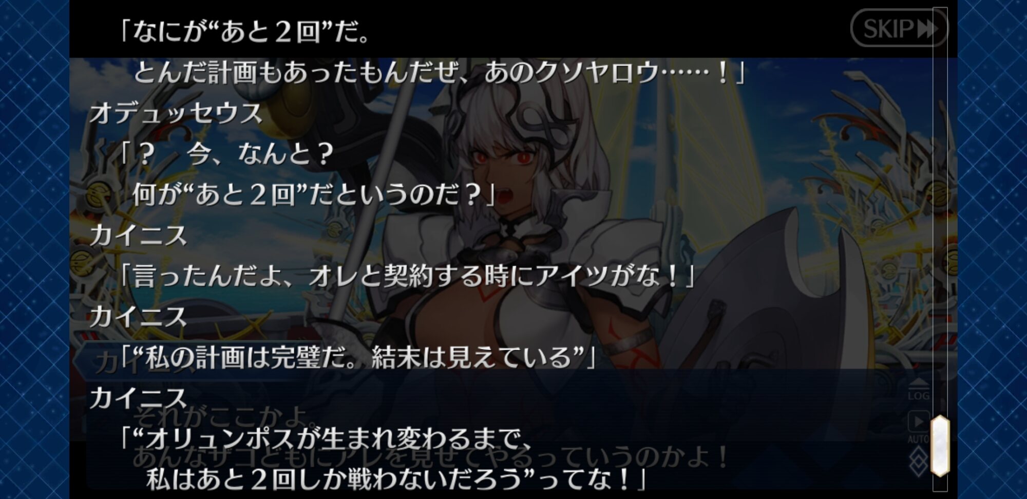 「根付かせる空想樹は一つでいいだと?つまり一つでも育ち切った時点でこいつ(異星の神)は降臨するというか。そうなれば、人類が抗う準備をする間もなくこの世界の覇権はこいつに握られてしまう。であれば、降臨先の基盤になる異聞帯の選択肢を設け、各異聞帯の空想樹が育ち切るまでの時間を捻出することで、異星の神降臨までの猶予期間を獲得しよう。となれば、彼ら6人の存在が必要だ。その上で私が請けもつ異聞帯の覇権を握ろう。異星の神にも、人類史にも、この先の未来を渡してなるものか」