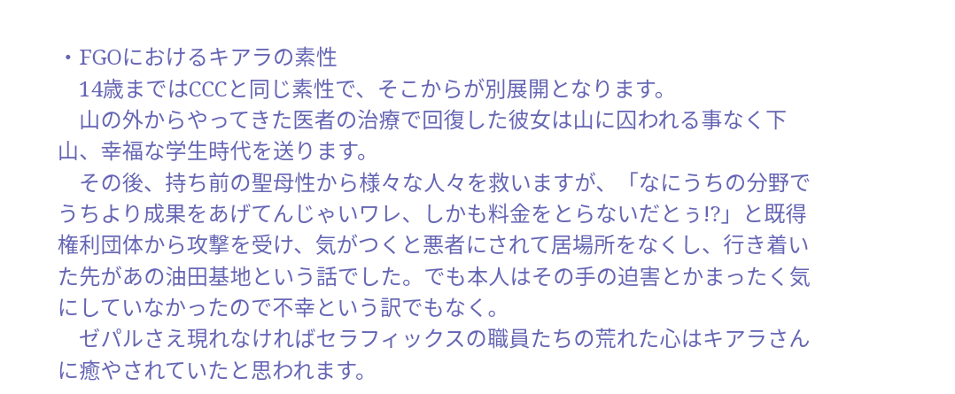 普通の世界に戻った藤丸君が、マシュや悪混沌のサーヴァント達との触れ合いを経て、精神科医を志し、キアラさんのいる大学に……。