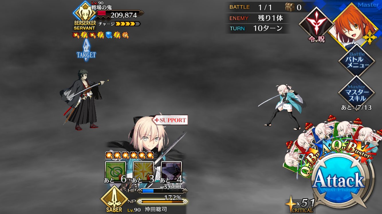 フレマーリンとスパさんのWリジェネ効果で瀕死でも一瞬で回復ですよww沖田単騎でチャレクエやってみたいけど、サポートでレベル1壬生狼ゲオルとかないと無理だった。沖田自身に壬生狼つけなきゃいけないのがきつい。