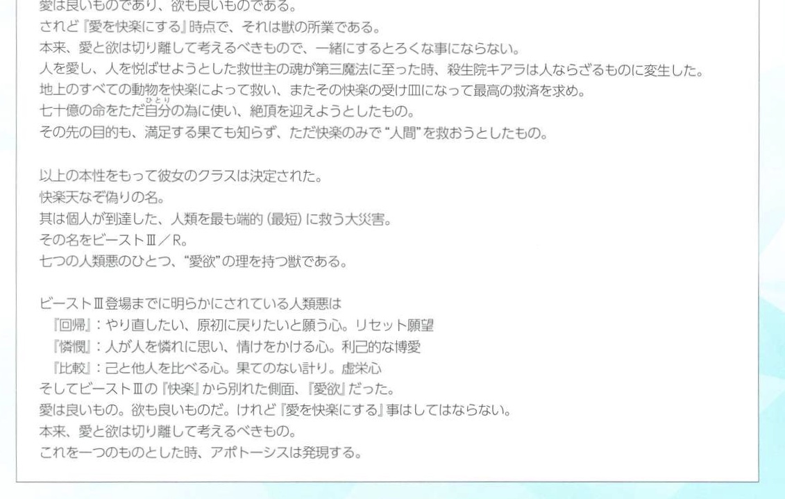 今回は自己愛と他者愛で愛欲になってたように他のパターンもあるかもということかな?加虐趣味と被虐趣味で快楽と堕落のビーストがいるとか。ただビーストⅢが新しくシナリオに新キャラとして出てくるということはないよ。公式設定でもないのに断言口調を使う奴はお察し、っと