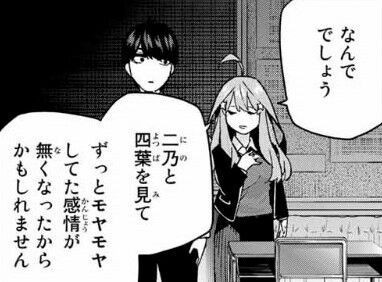 五月推しとしては好意が示されてそれに決着がつけられただけまだよかったとはいえ、最終回に向けた後処理みたいな形のものじゃなく風太郎が答えを出す前に自覚するシーンなり読者へのはっきりとした提示をしてほしかった。1人だけヒロインとしての扱われ方が違いすぎてモヤモヤする>>977