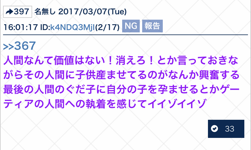 自作、他作を問わずコラを含む公序良俗に反した猥褻な画像を貼る際には、直接貼らずに画像のURLを貼ってください