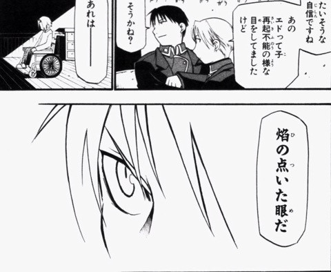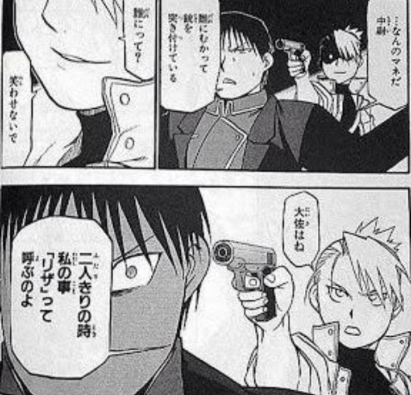過去に大佐が師匠の死に際の時にホークアイ中尉の事を「リザ」って呼んでいた場面を覚えている読者ほど、このブラフに騙されやすいっていう巧い場面だよね。>>874