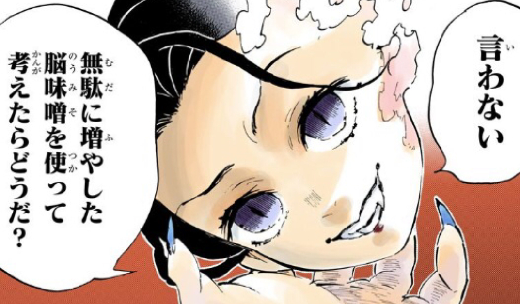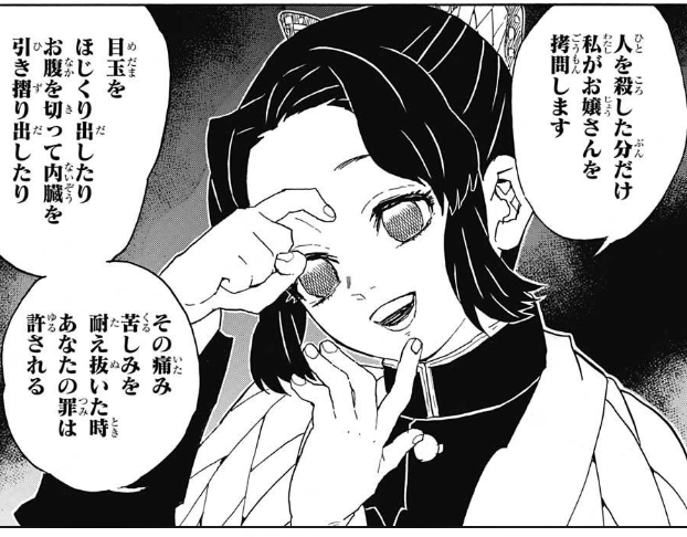 そのシーンでやべーやつだ言われてたけど性格が違う姉エミュを無理にしてるのと鬼への怒りを堪えてる事の歪みからくるものだったというしのぶさん姉エミュとよく言われるが