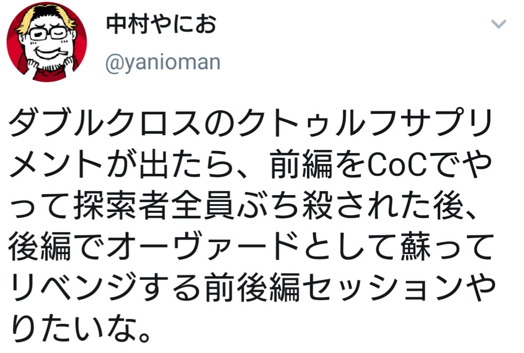 大丈夫ですリプレイ動画とか見ているとクトゥルフやりたくなってきちゃうな……大正浪漫とか産業革命期のロンドンとかめっちゃプレイしてみたいが、サプリお高い。