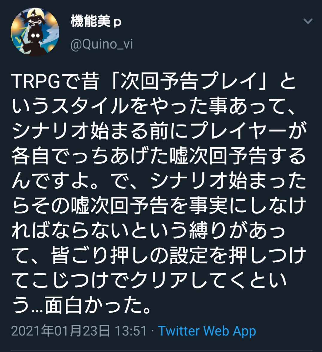 捏造ミステリーTRPG…初めて聞いたけど、中々面白そう。虚構推理みたいなことをできるのね。>>970