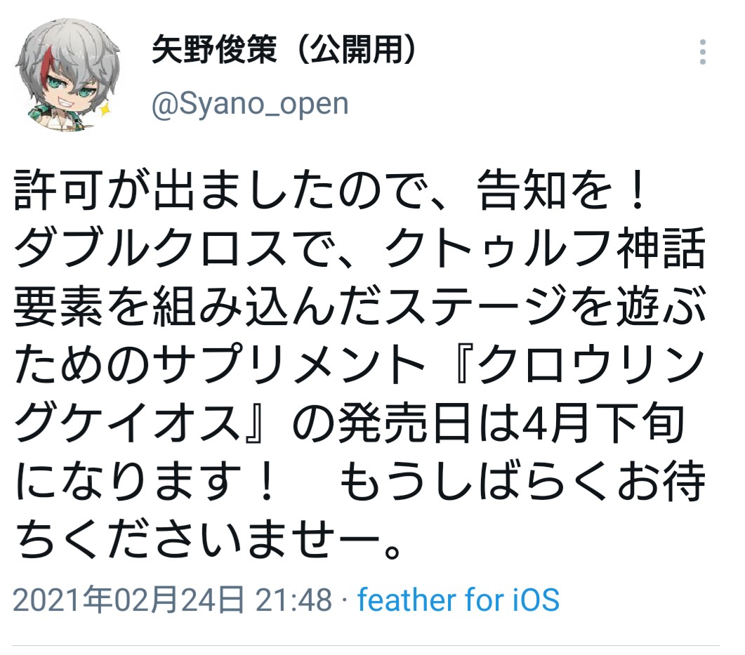 うっかり難易度間違えるとさっくり探索猫が死にかけますが最近ダブルクロスばっかりだったからクトゥルフが恋しくなってきた……もうちょっとクトゥルフのシナリオの用意か作成が易しかったら楽にやれたんだろうけど。