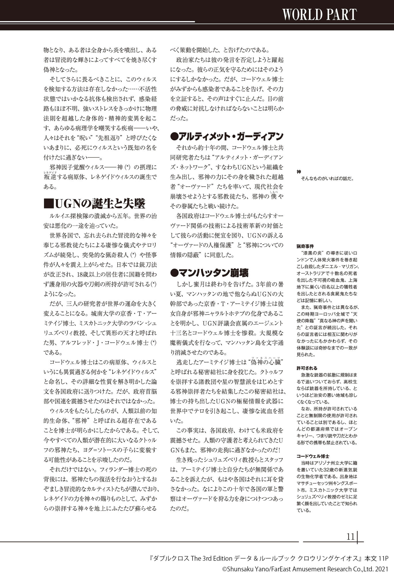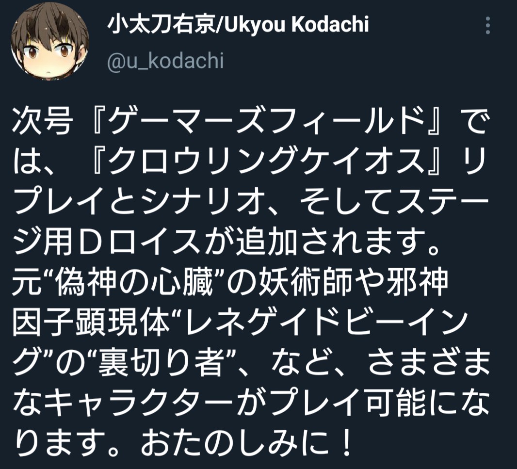 クロウリングケイオスの世界だと闇落ちしているキャラはココの過去セッションPCでも結構いそうやな……通常世界でも誕生経緯が邪神関連だった司馬先生はあっちの世界だと厄ネタ過ぎる…。レネビは基本的に全部ジャームらしいかねクロウリングケイオス世界