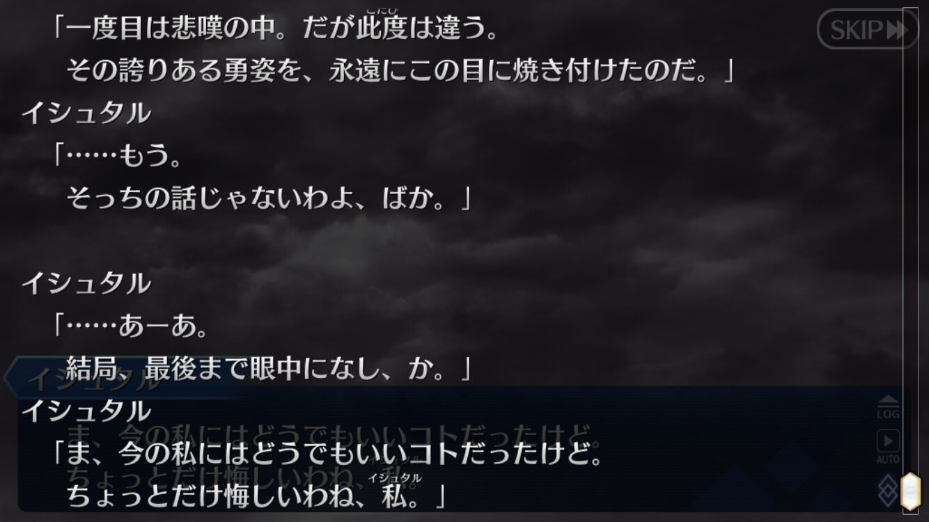 ゲームだとイシュタルはあそこまで甲斐甲斐しくないし、エレシュキガルも原作にあったコミカル部分も大人しめで生来の根暗な性格が出て彼女の悲劇性が浮き彫りになってた。総合的に見たら面白かったと思う