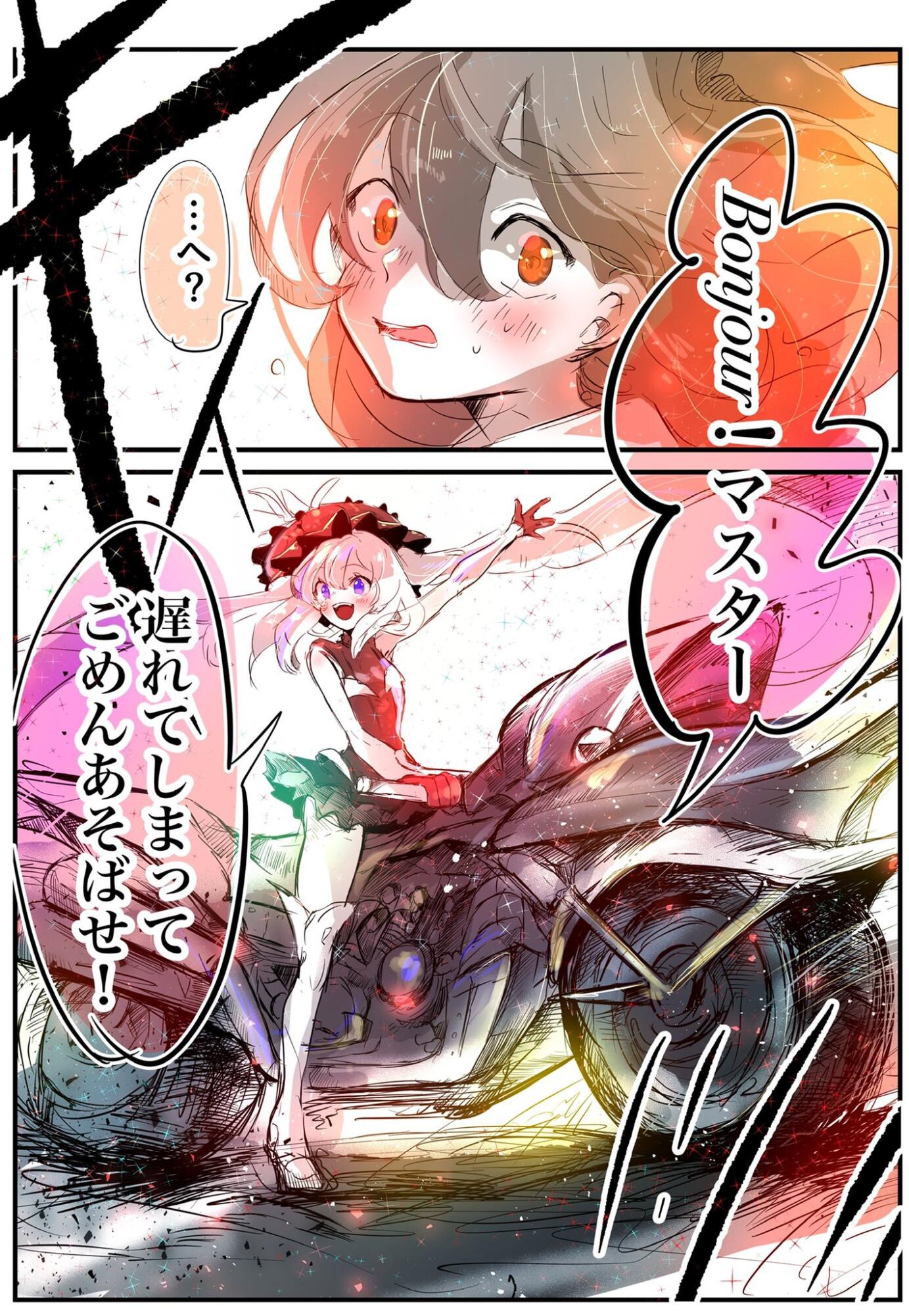 「いいだろう、自分の不始末だ自分で片付けるさ。だがその前にコイツらを始末してからだ」「流石は荊軻、理解が早いの良いことだぞ。それに今回の朕の同行にはマスターの意向も組まれてるぞ。」「はあ!?それはどういう事だ!」戦いながらも途切れなく続く会話、敵を屠りながらもなおも続き「其方今回で絆レベル?とやらが最大になるのであろう、いや~朕も実は今回で最大になるんだよねーすまぬなー朕後から来たのに追いついちゃってーでも朕ってばめっちゃ有能だから仕方ないかなーという訳で“共に絆レベル10”とやになってみるか!」合点がいった。今日は私だけではなく一応奴にとっても大切な日となるのだな、だから相容れぬ二人を一緒に連れて解り合えなくても共に戦える事を我が主は伝えたかったのかその心遣いに感謝を。ありがとう我が愛しきマスターよ。最後の1人を仕留め荊軻は優越感浸っている始皇帝に声を掛ける