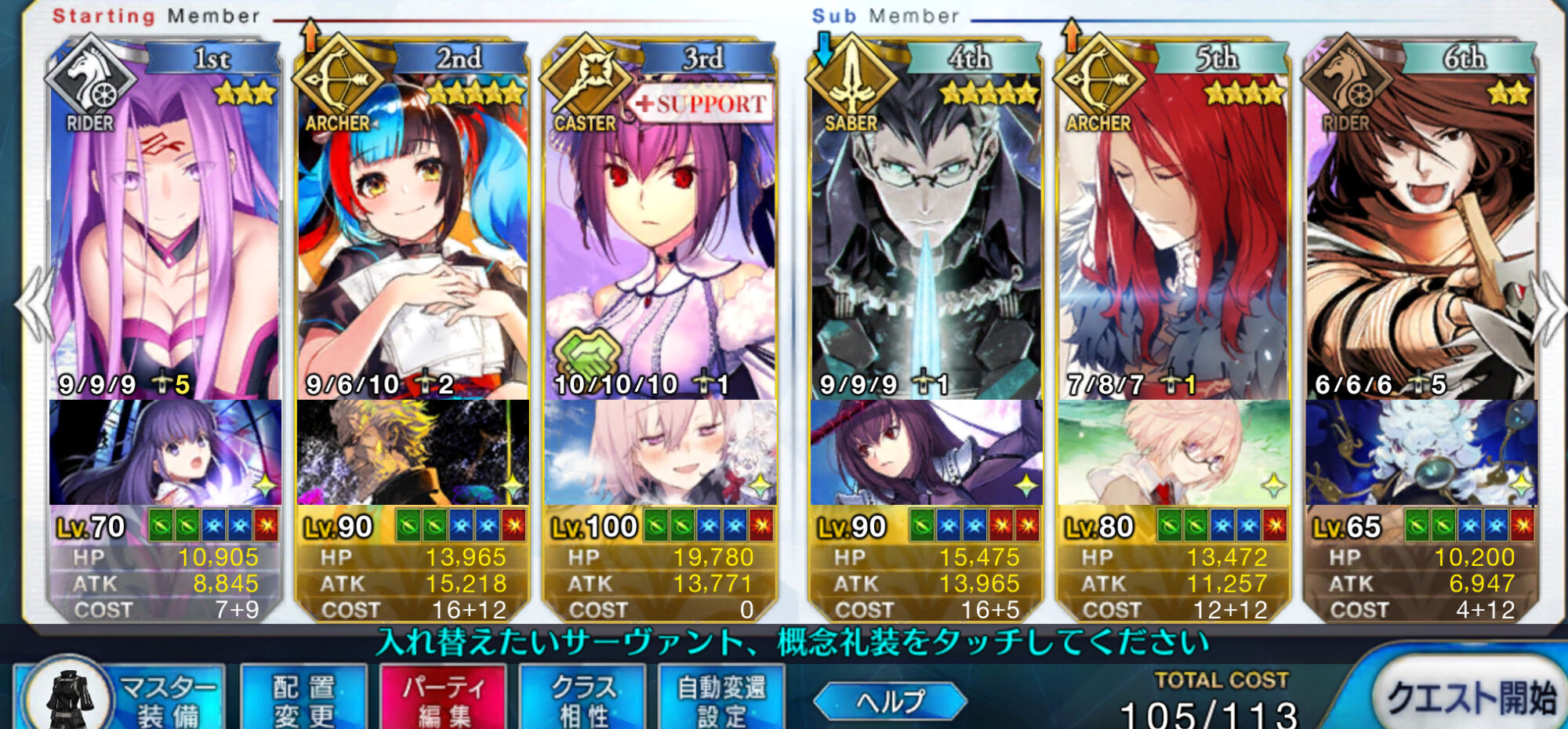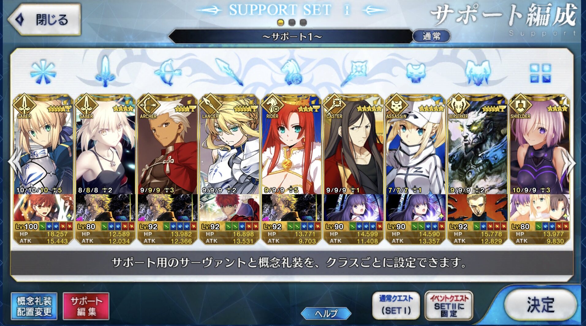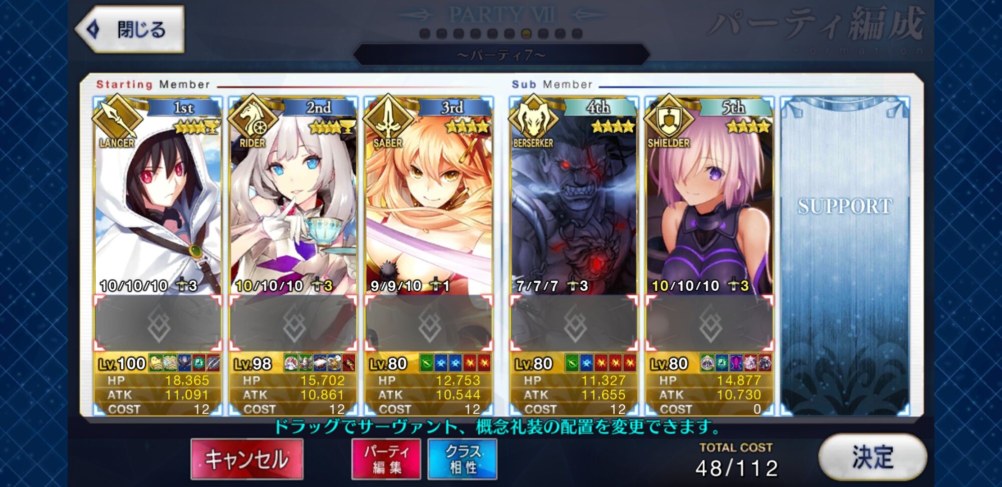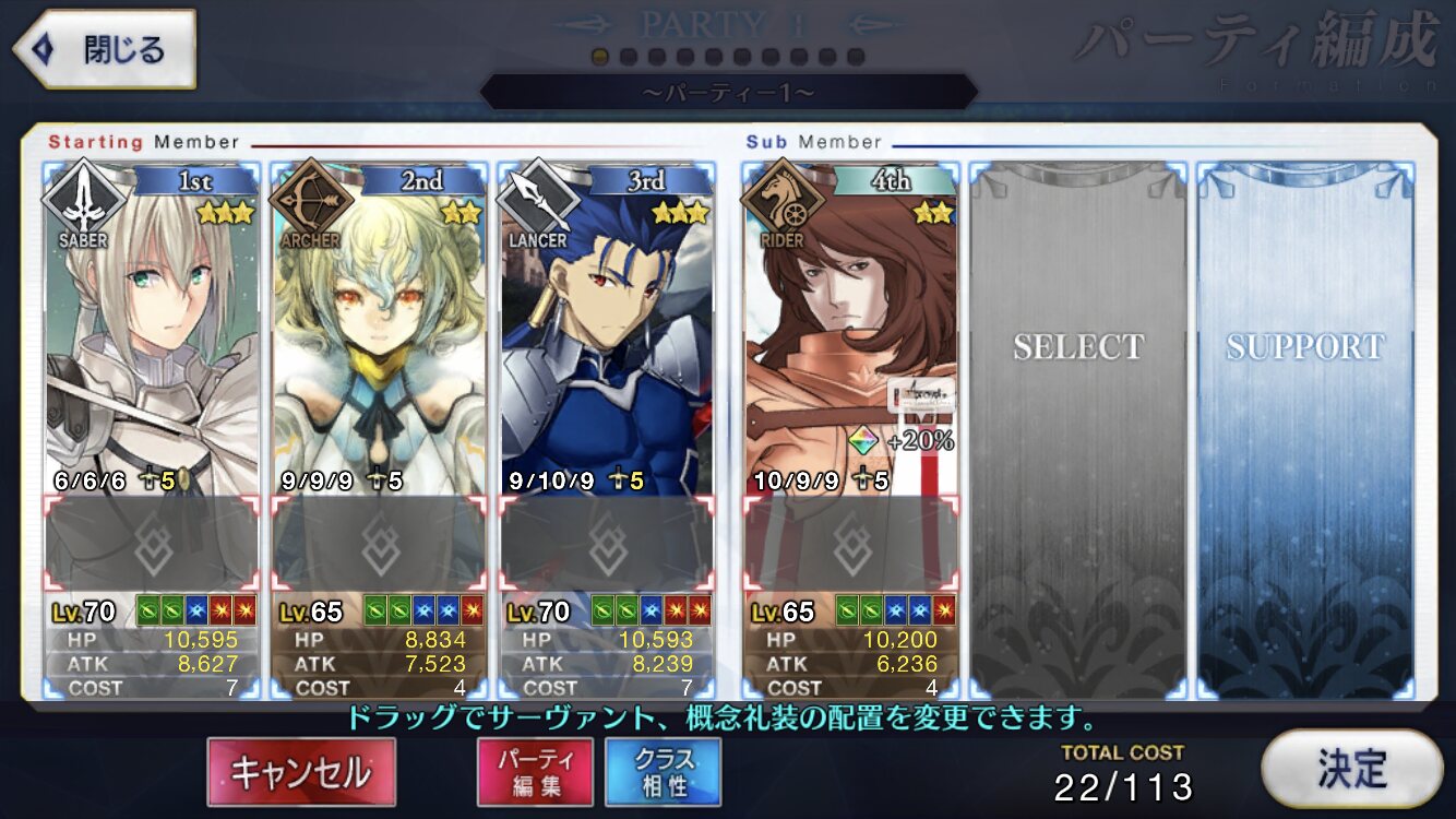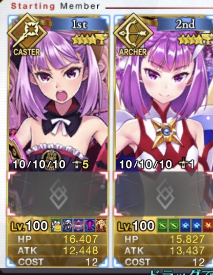 ②マリー:回数性の無敵に大回復に味方全体の攻撃バフに無差別単体魅了に味方全体の回復&弱体解除にクリバフと色々盛りだくさんな王妃様.特にスキル2のターン制限のない無敵からくる耐久性は非常に高く,スタメンなのに殿まで生きたとかもあり得るほど.欠点としては「回数性なので落ちるときはあっさり落ちる」「同様に,全体攻撃連打してこられると脆い」「火力があまりない」「通常攻撃のNP効率が劣悪なのでアーツチェイン狙わないと宝具撃てない」