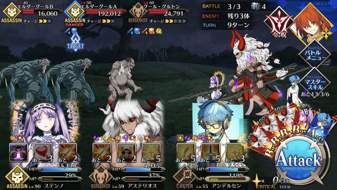 ⑤百貌さん:低レアの中でアタッカーとして優秀なアサシン.素のNP効率はそこそこなものの,自身のNP効率上昇&アーツバフが乗った状態から宝具アーツチェイン繰り出せればまた宝具撃てるほどの回転力を見せる.地獄の6章超えれば宝具後にアーツデバフが入るようになって更に回転力が上がるようになるし,それでなくても宝具が回るので凄く攻めれる.回避と回復という最低限欲しいものも持っているのも魅力.超オススメ!!>>35