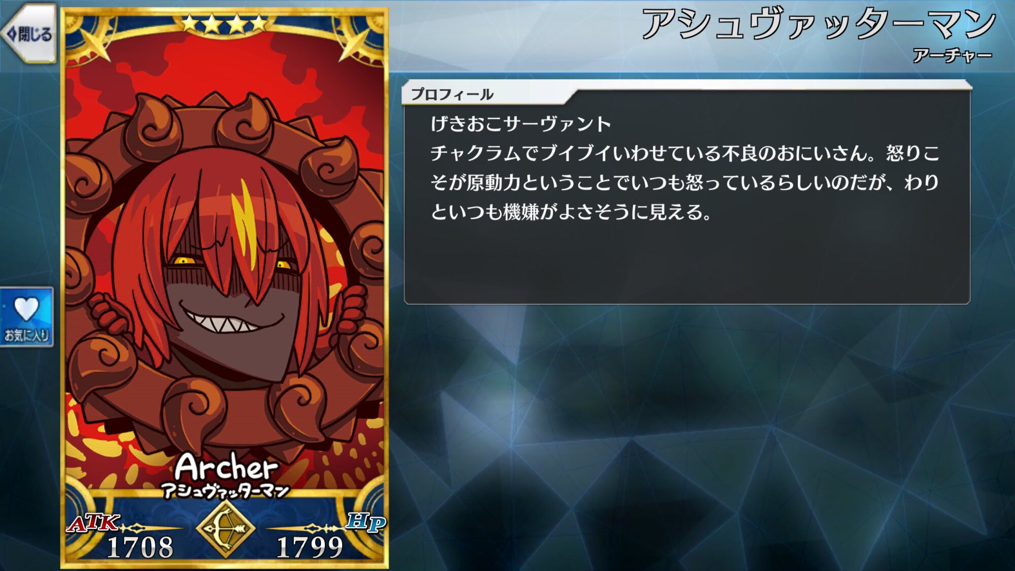 最後はラーマ!ラーマーヤナの主人公だ!ストーリーで出てくる魔獣やマハーナーガやバイコーン狩りで使える魔性特攻宝具!未育成でも使い勝手が良くて育てきると宝具級のクリティカルが出せる武の祝福!全体の火力向上が出来てクリティカルや特攻に乗算されるカリスマ!ここぞと言う時は頼りになる離別の呪い!宝具倍率が低かったり自力でスターを出しづらい欠点もあるので注意しよう!幼い見た目に反して中身は愛妻家で滅茶苦茶カッコいい!一部五章と二部四章に出演!戦闘はあんまり描写されないけどどっちでもしっかり英雄してるよ!決して会えない妻にそれでも会おうとするラーマ君は幼さとカッコよさが共存していて…最高…!一途で尊大で英雄で幼い彼をどうか導いてあげて欲しい…!