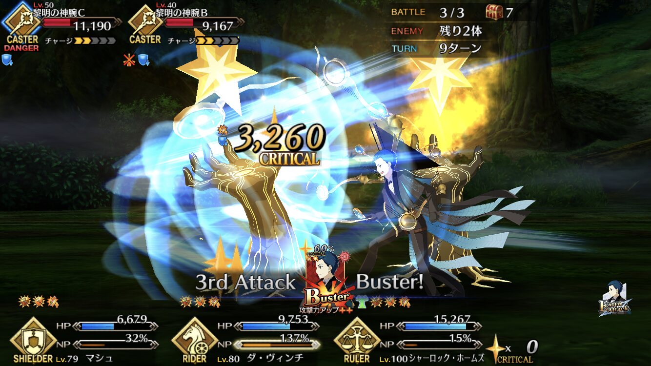 確かホームズ何か入ってる(混じってる?)感じだったよねホームズ役「一部の際、シャーロック・ホームズ役に選ばれたにあたって、新しくフェンシングを習い始めたんですよ。お陰で二部二章での魔剣襲来とかアトランティスのケルベロス戦のアクションや殺陣はほぼほぼ自分でやれました。途中で怪我もしましたけど(笑)。今回のオリュンポスでも、私が演じるシャーロック・ホームズの殺陣がありますし、今までやってきて掴んできた『ホームズらしさ』というのを全力で演じますのでどうかfate/grand orderをどうかよろしくお願いしますね」